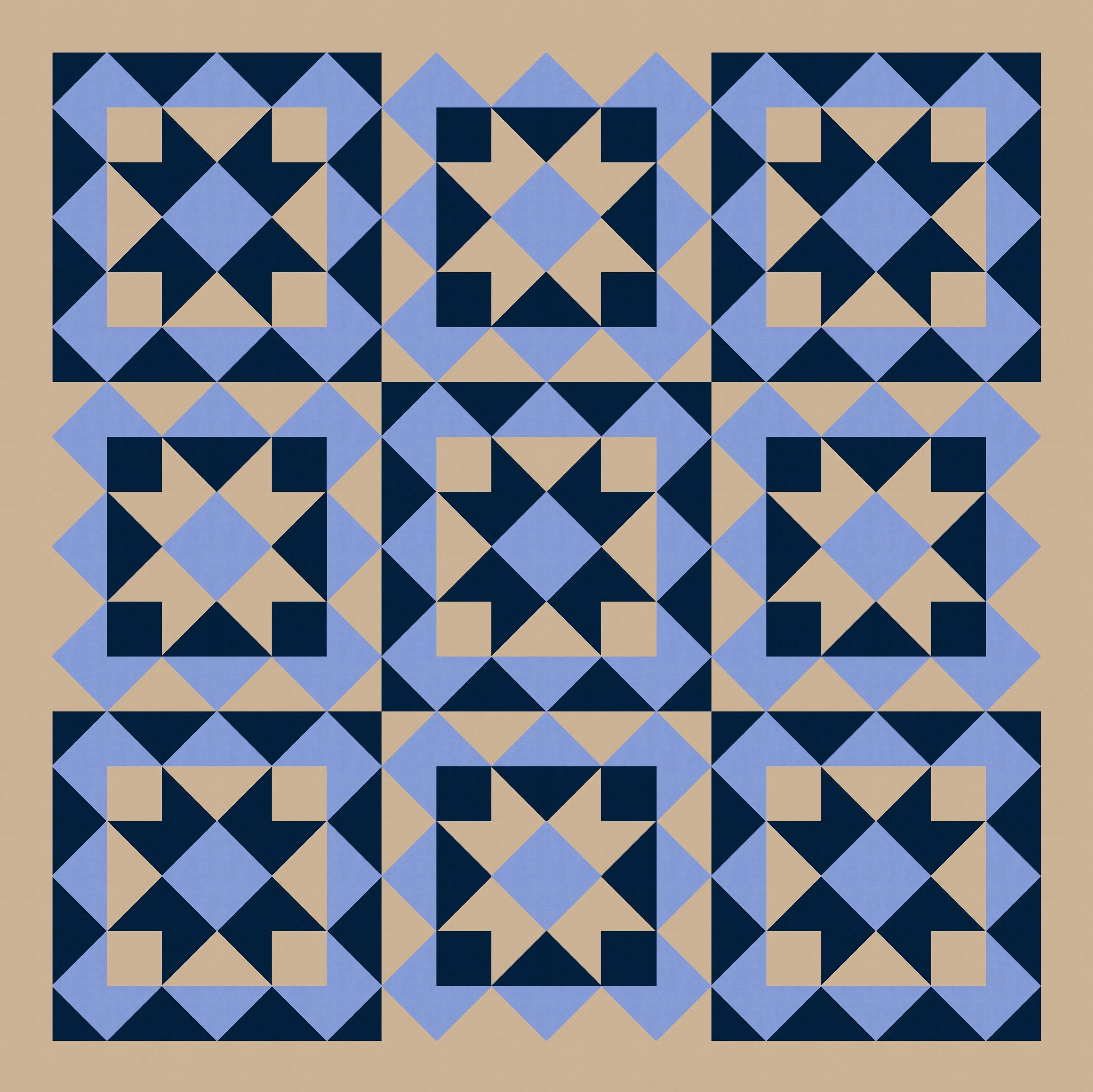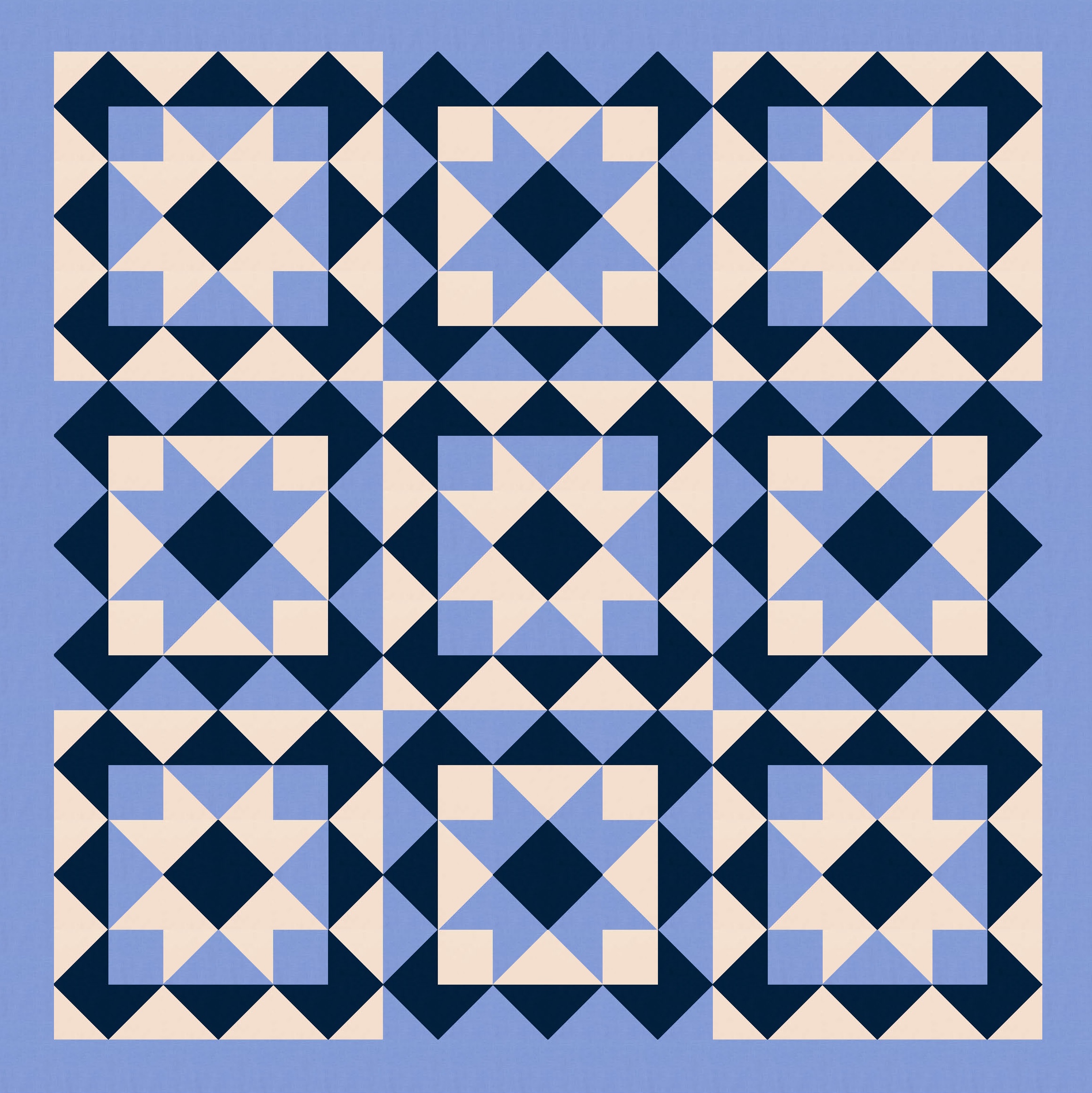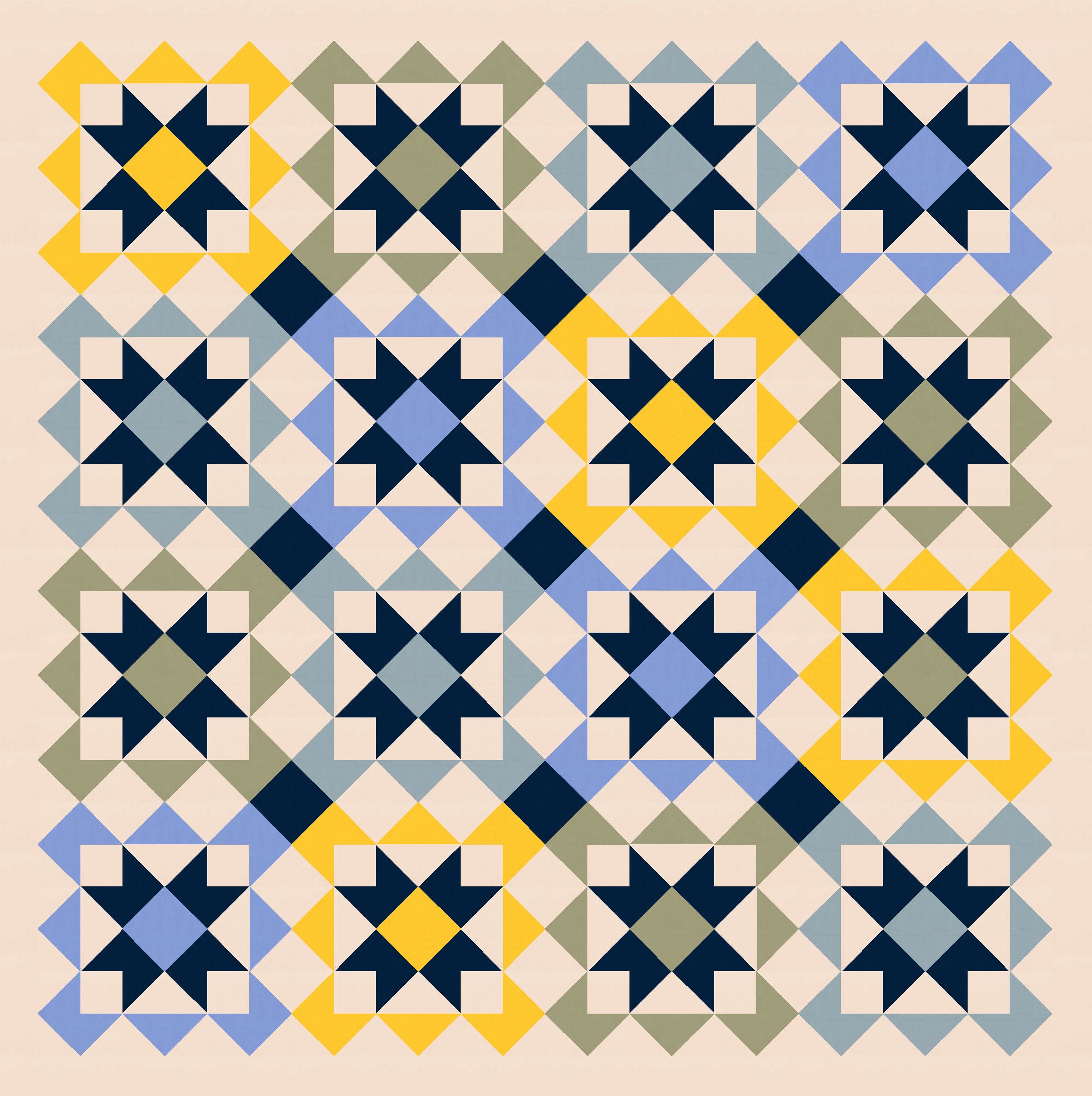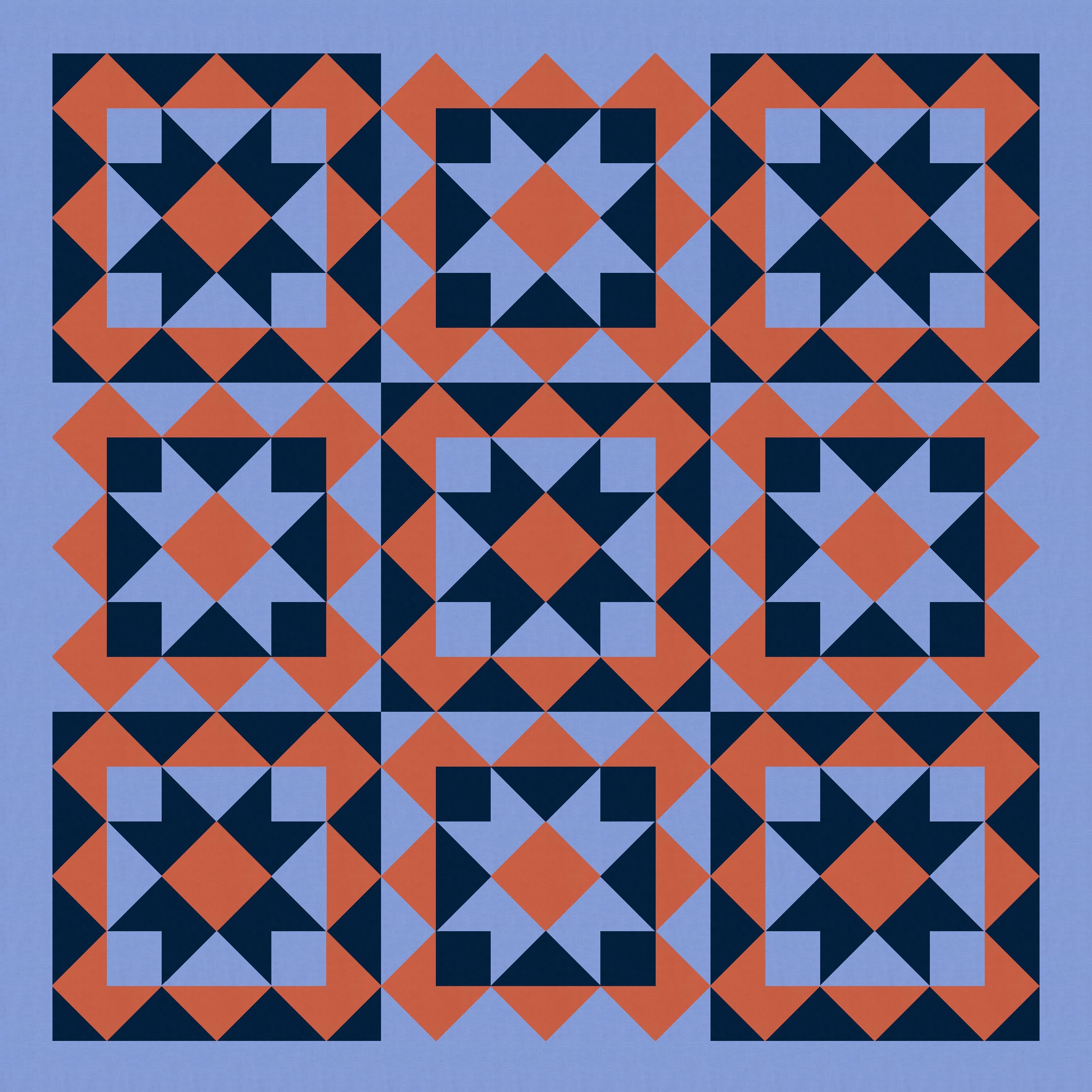 Anyway, I also tried a larger palette and colouring the blocks differently. I’ve used the background colour consistently across all blocks, as well as that darker colour to tie things together. I like how colouring those squares in the middle (the ones on point, between the blocks’ corners) connects the blocks diagonally too.