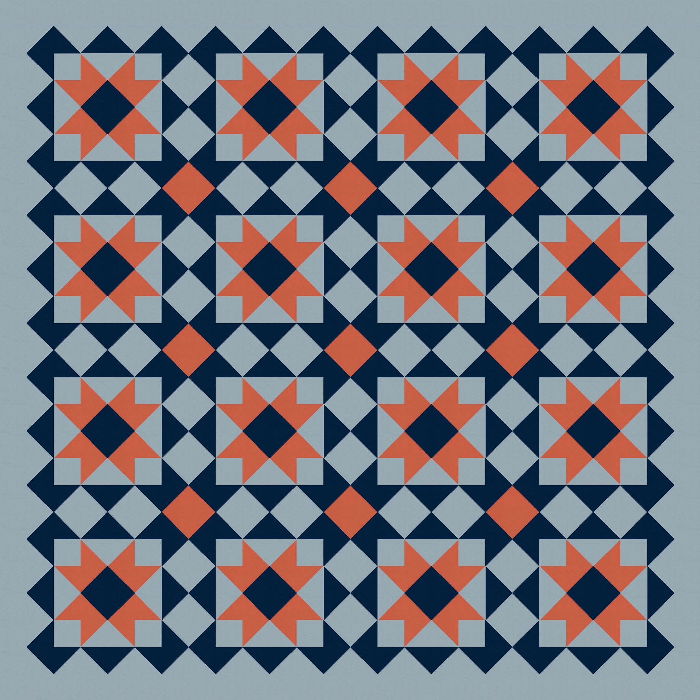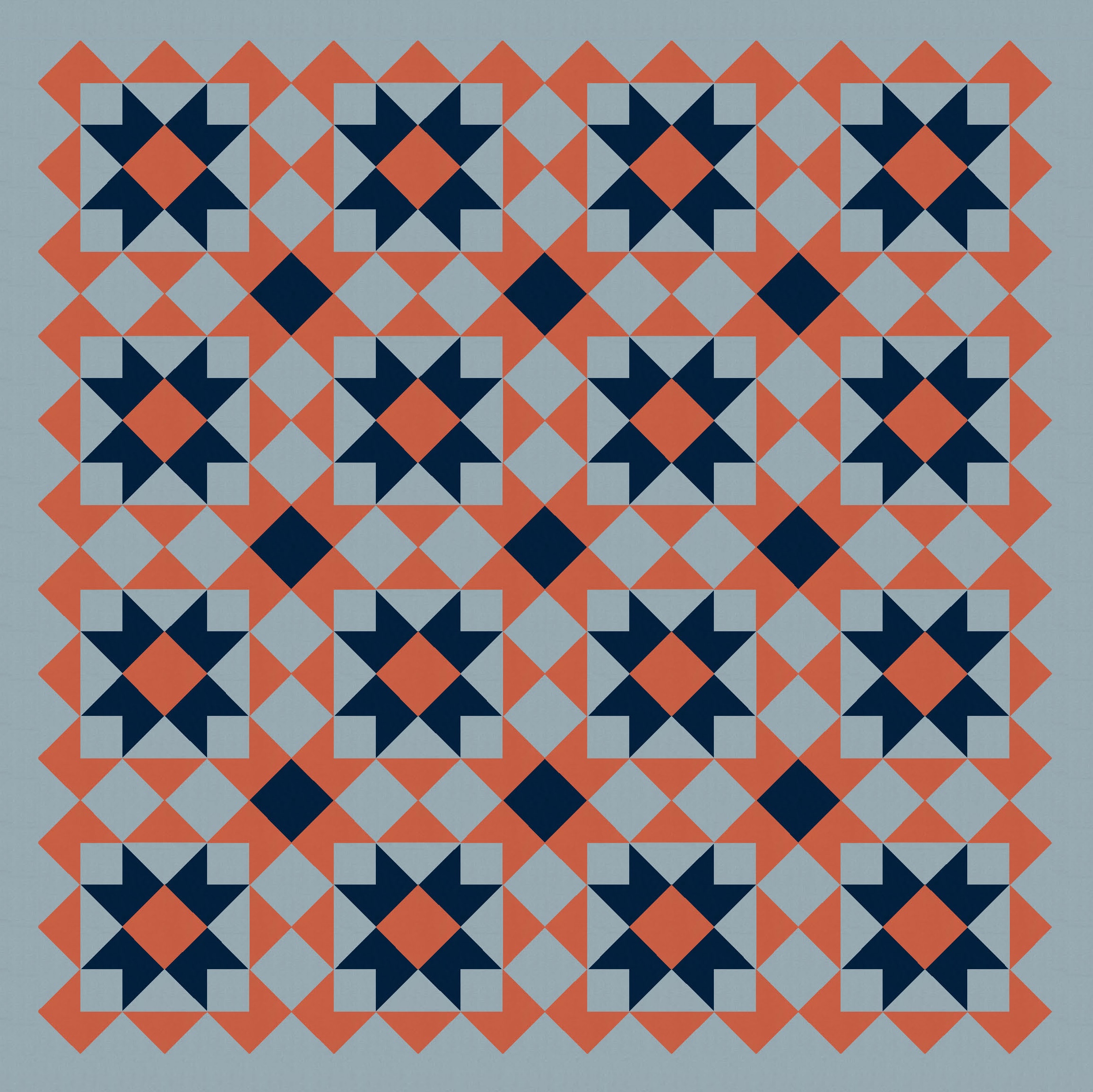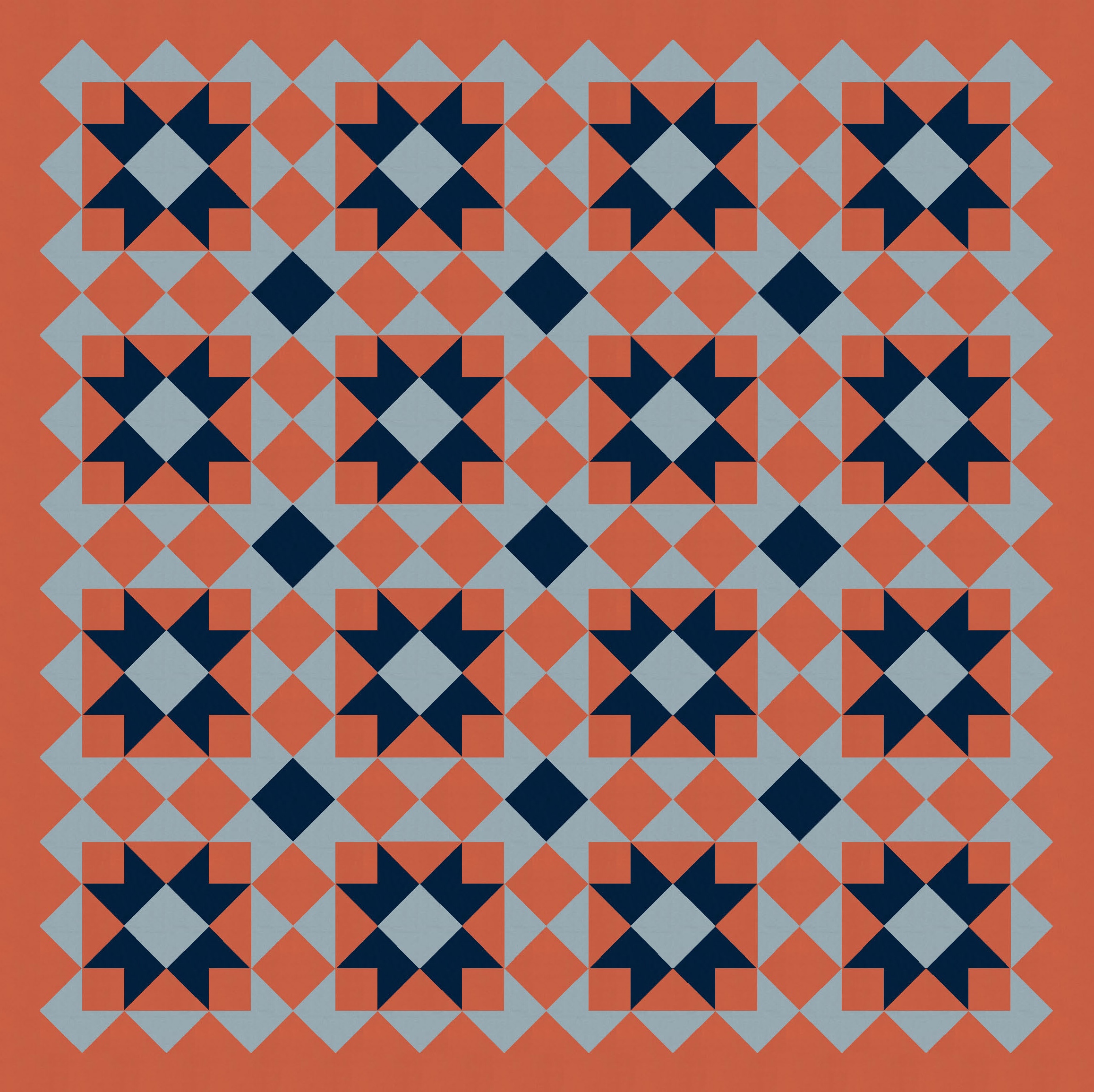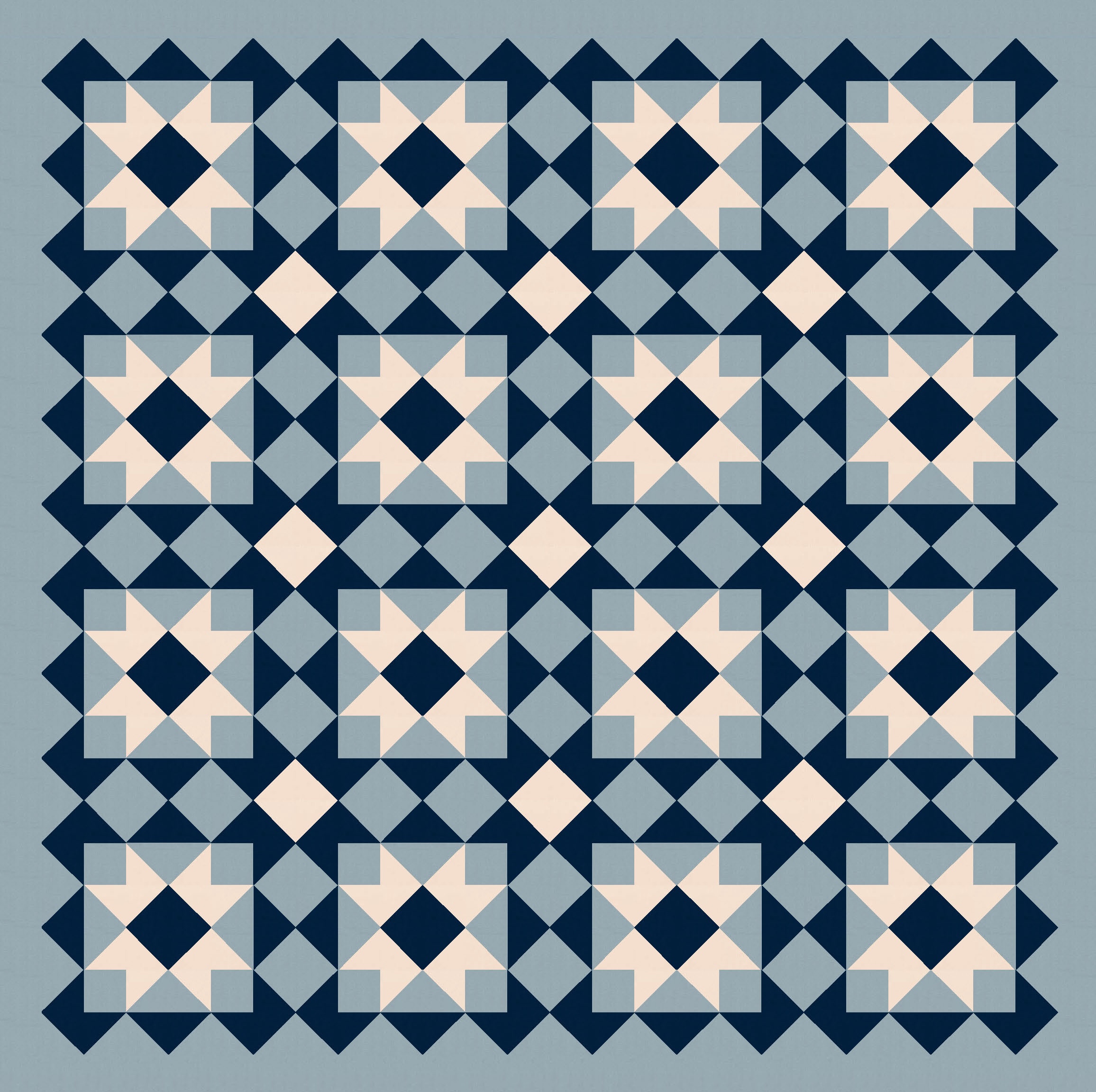 So I started with a block very similar to one in Tectonic (the outside is the same; the inside there was a cross, whereas here it’s a sawtooth star*) and just tiled it. I also coloured in some of the interstitial spaces between blocks, using the same colour as the sawtooth stars. (That ends up making more sawtooth stars in the opposite colourway.)