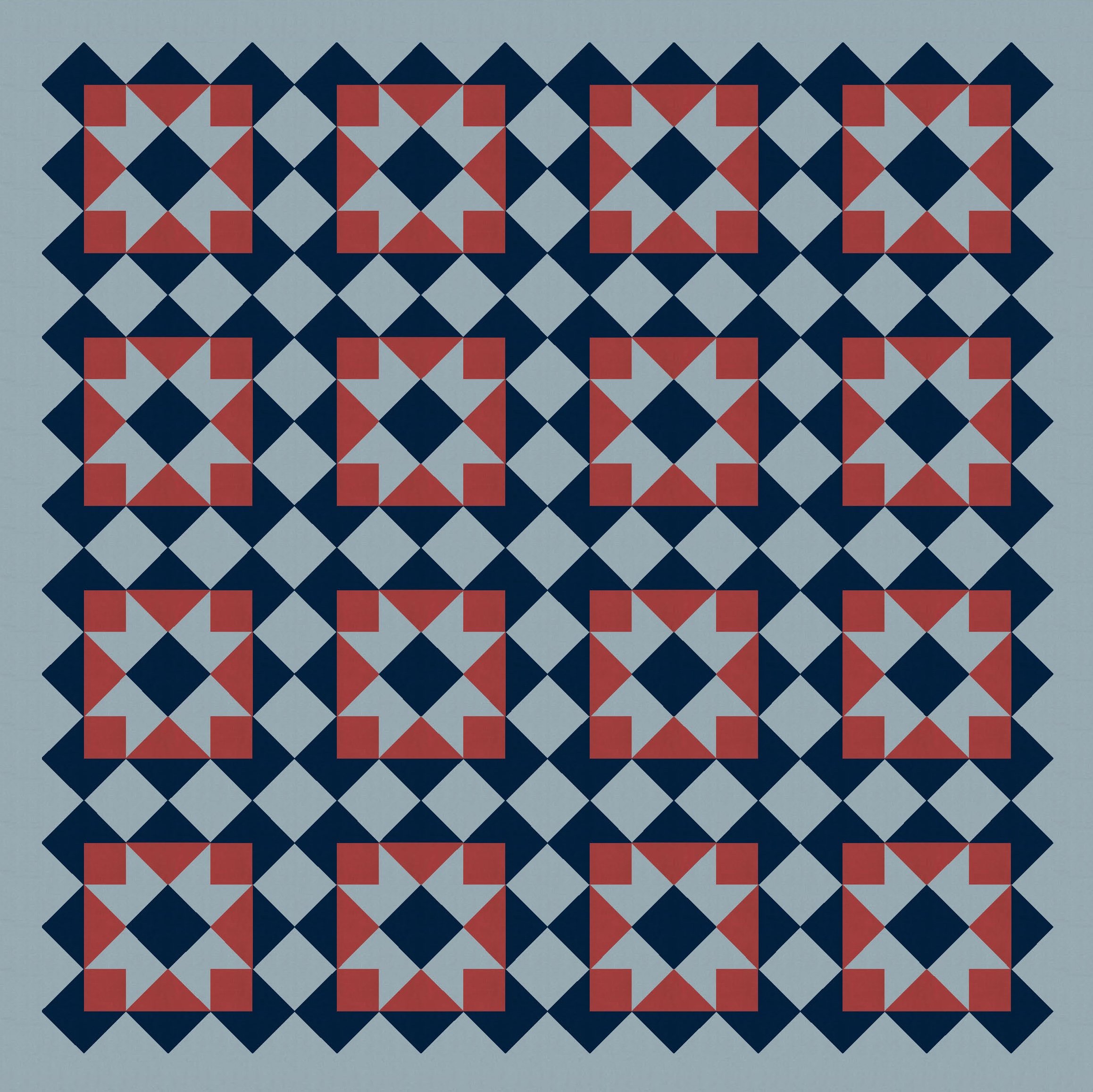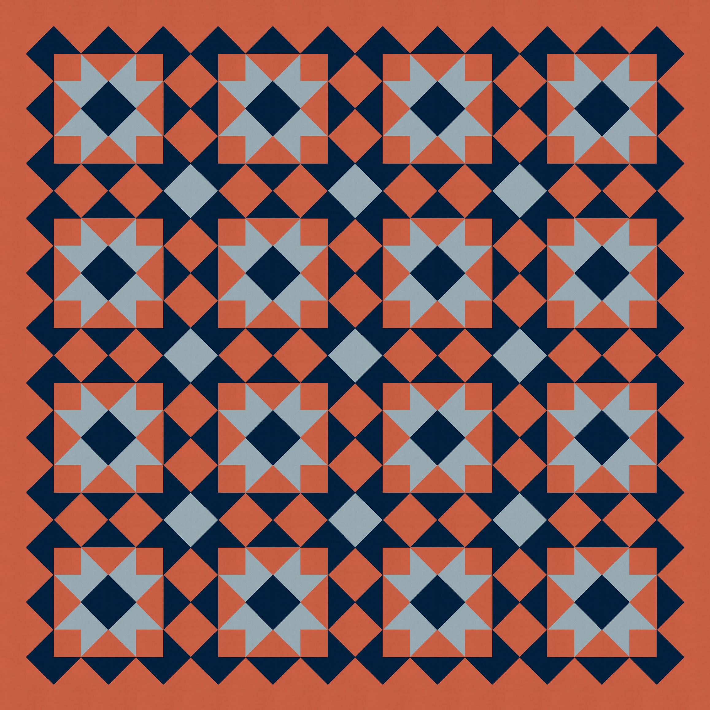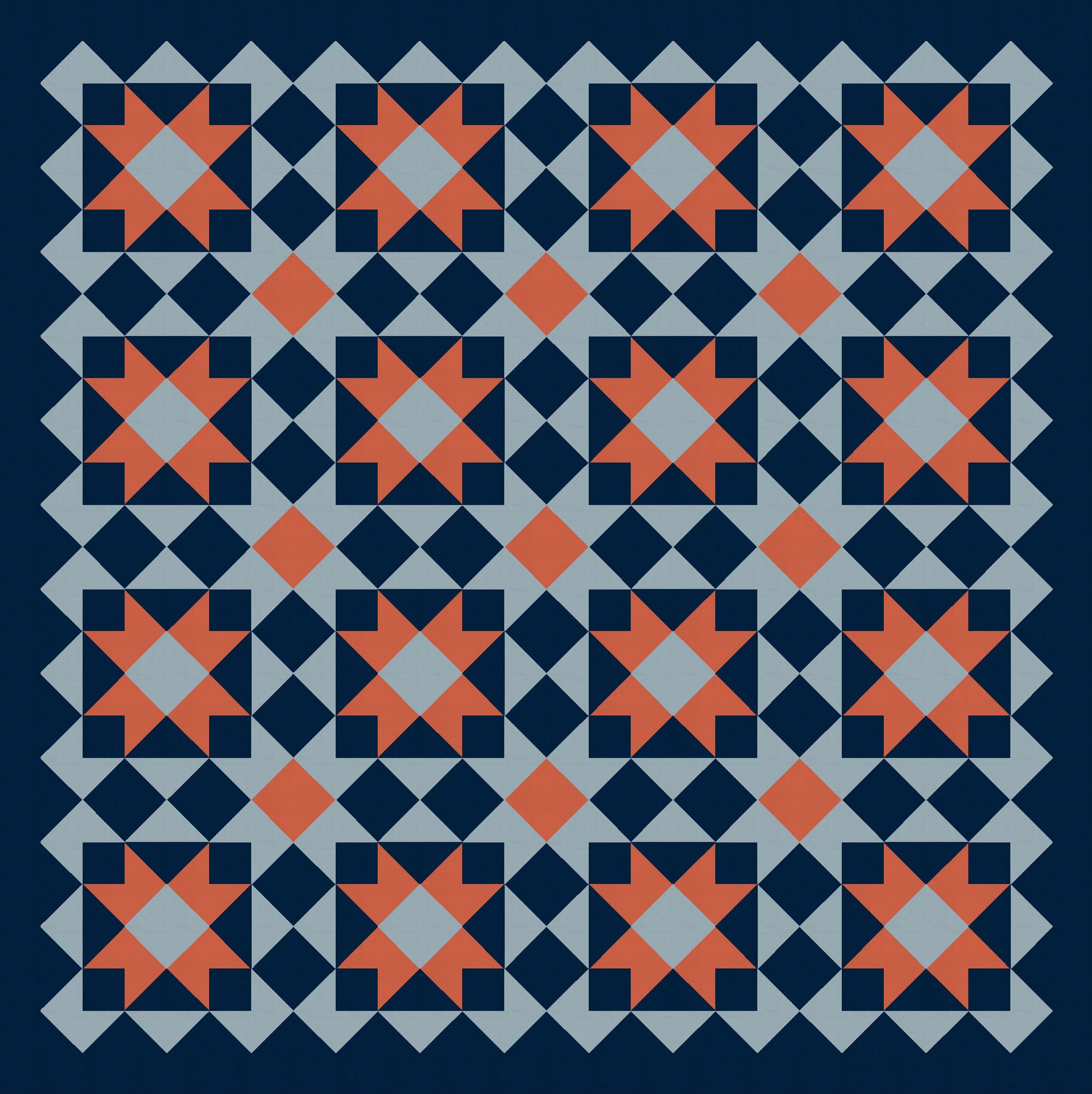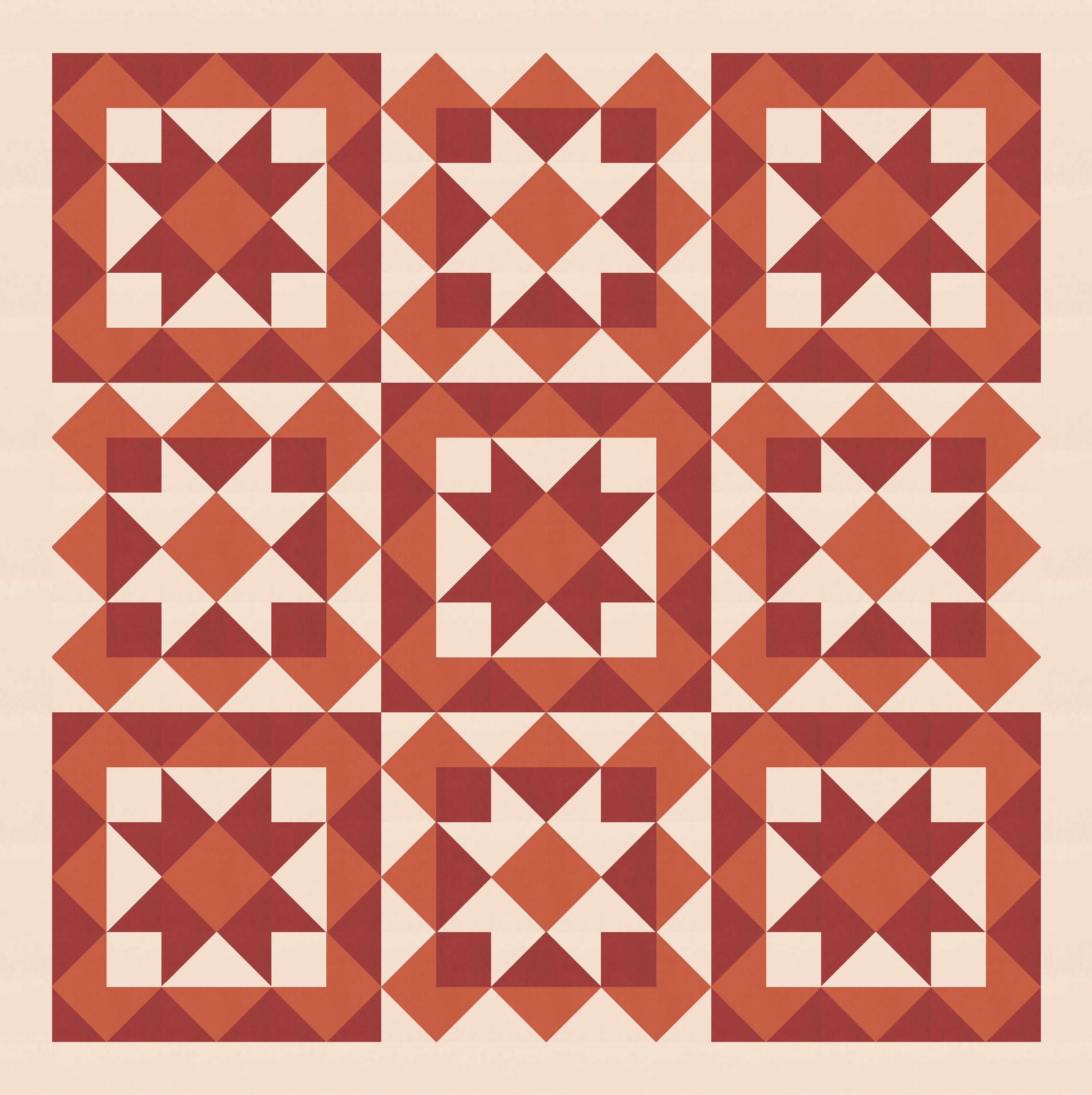 So I started with a block very similar to one in Tectonic (the outside is the same; the inside there was a cross, whereas here it’s a sawtooth star*) and just tiled it. I also coloured in some of the interstitial spaces between blocks, using the same colour as the sawtooth stars. (That ends up making more sawtooth stars in the opposite colourway.)
