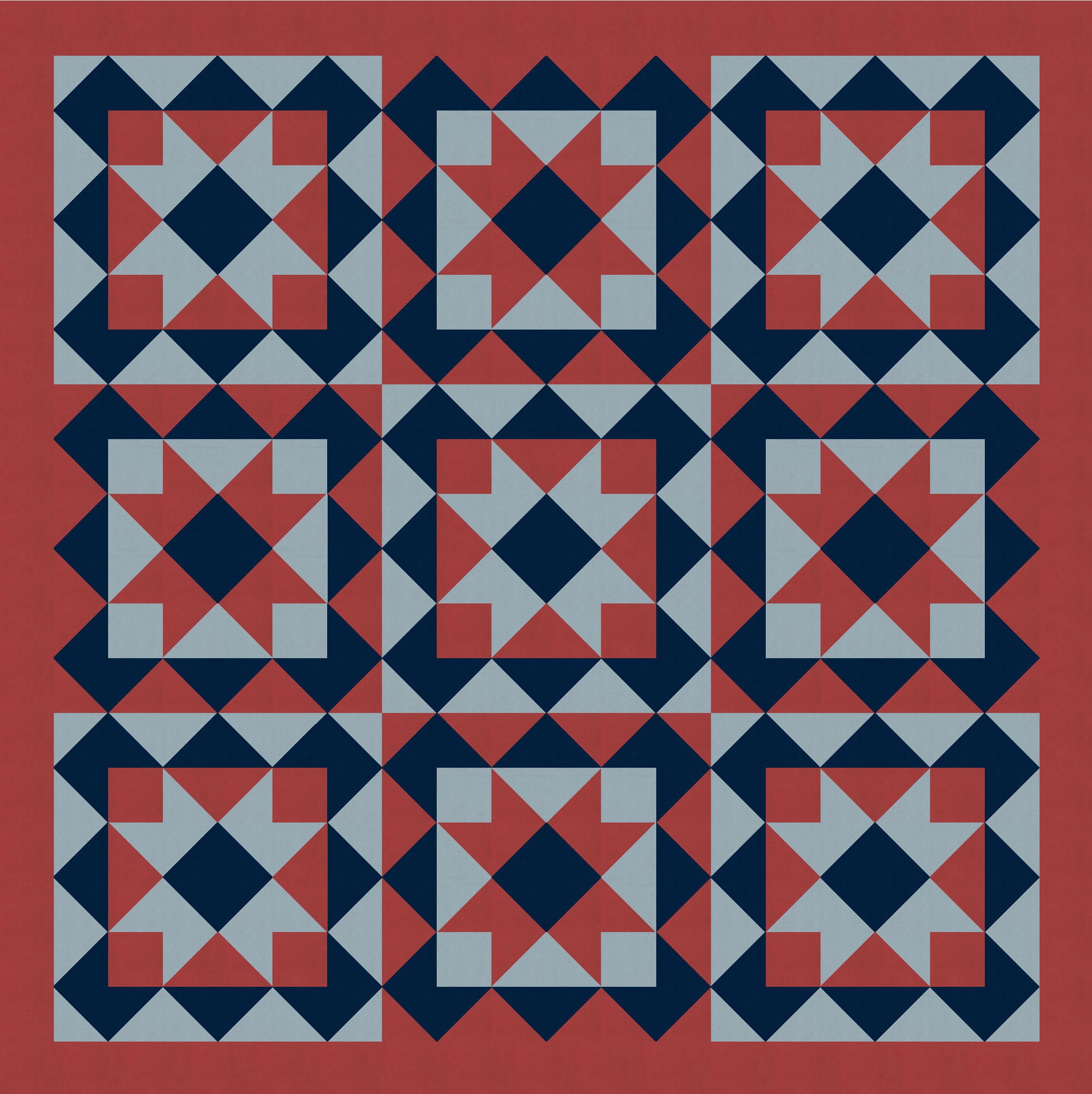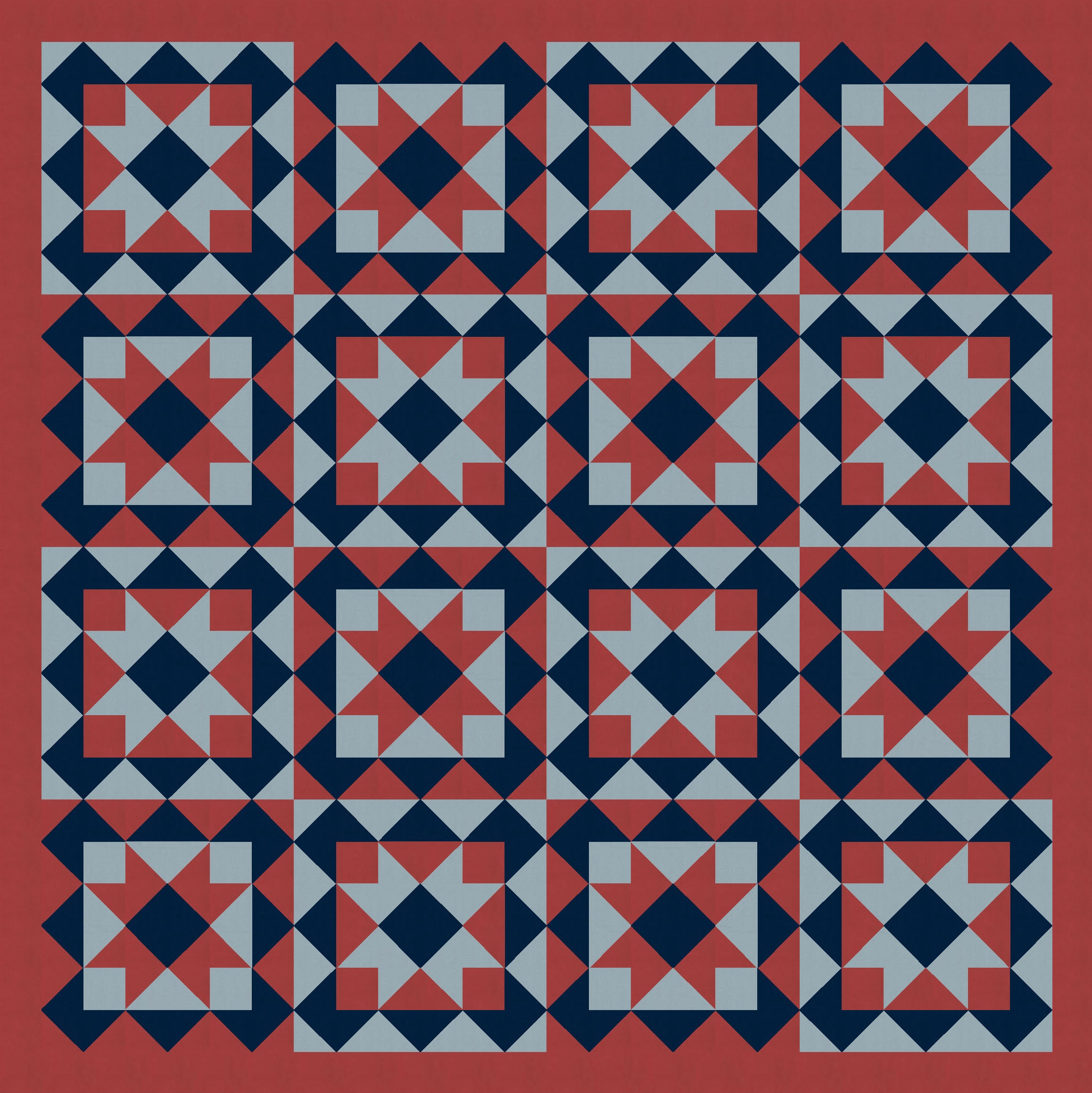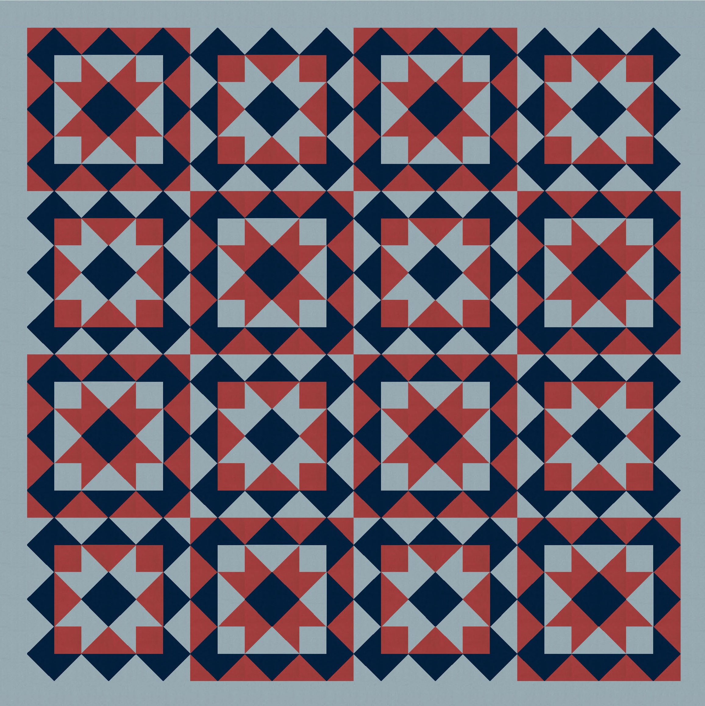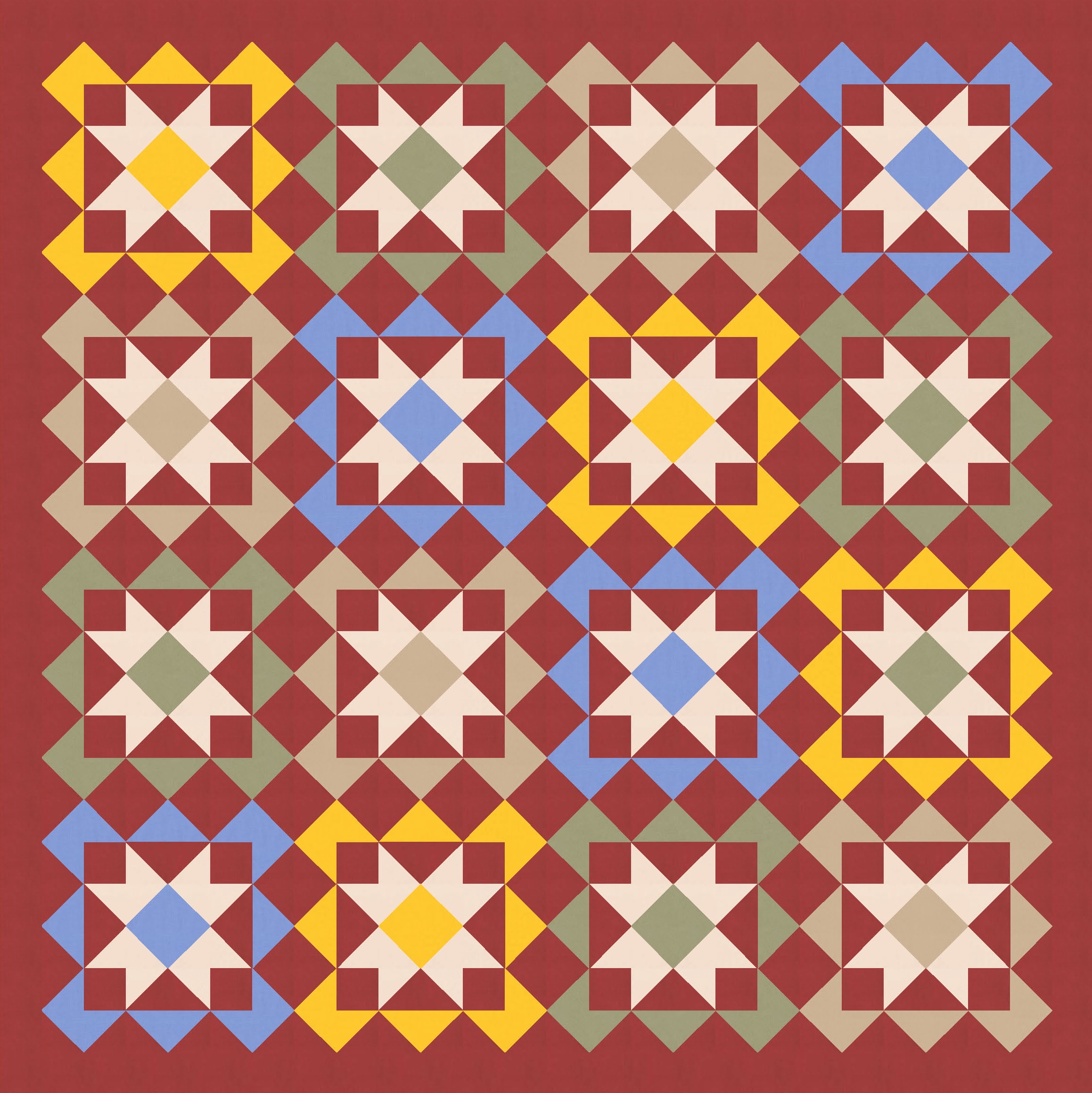 …and also changing the placement of the background colour within the blocks. Originally, the sawtooth stars (in a consistent colour) were surrounded by a square of background colour; in the next few versions, the stars themselves are in the background colour, and the surrounding squares take on the consistent colour. It just shows how easily you can tweak even simple designs.