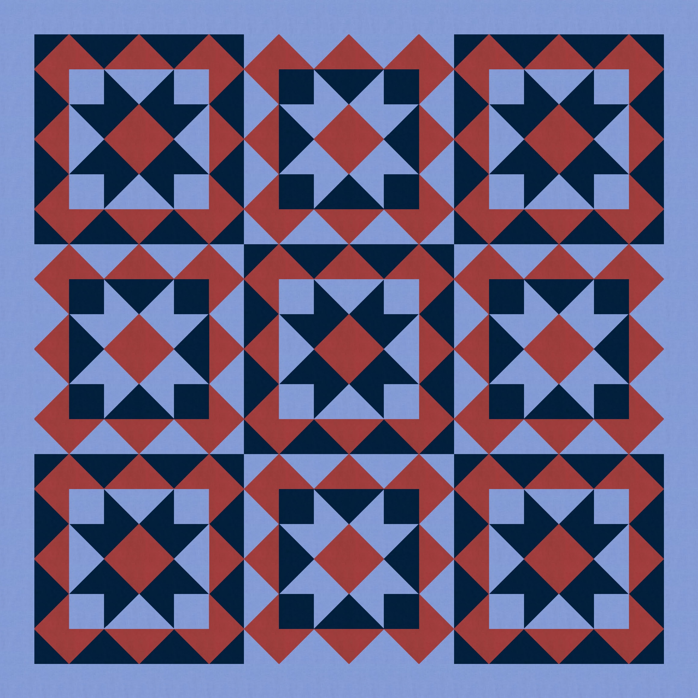Depending on where the light, medium and dark colours are placed, you can see different shapes or movement emerge. In those last two versions, for example, I can see a big diagonal shape (more like a square on point) emerge between the sawtooth squares in the background colour (the four blue stars in the left version; the four red stars in the right version).