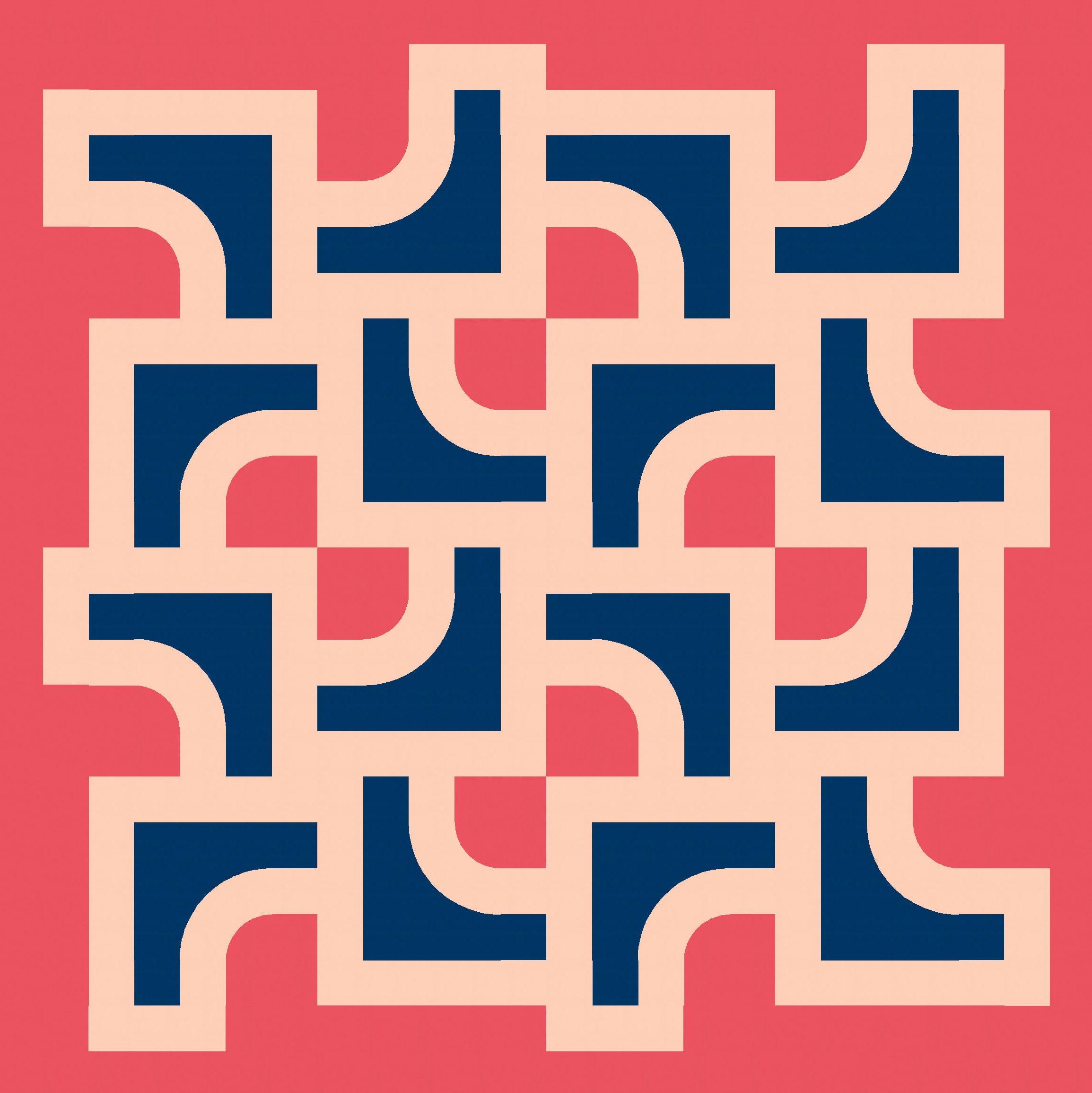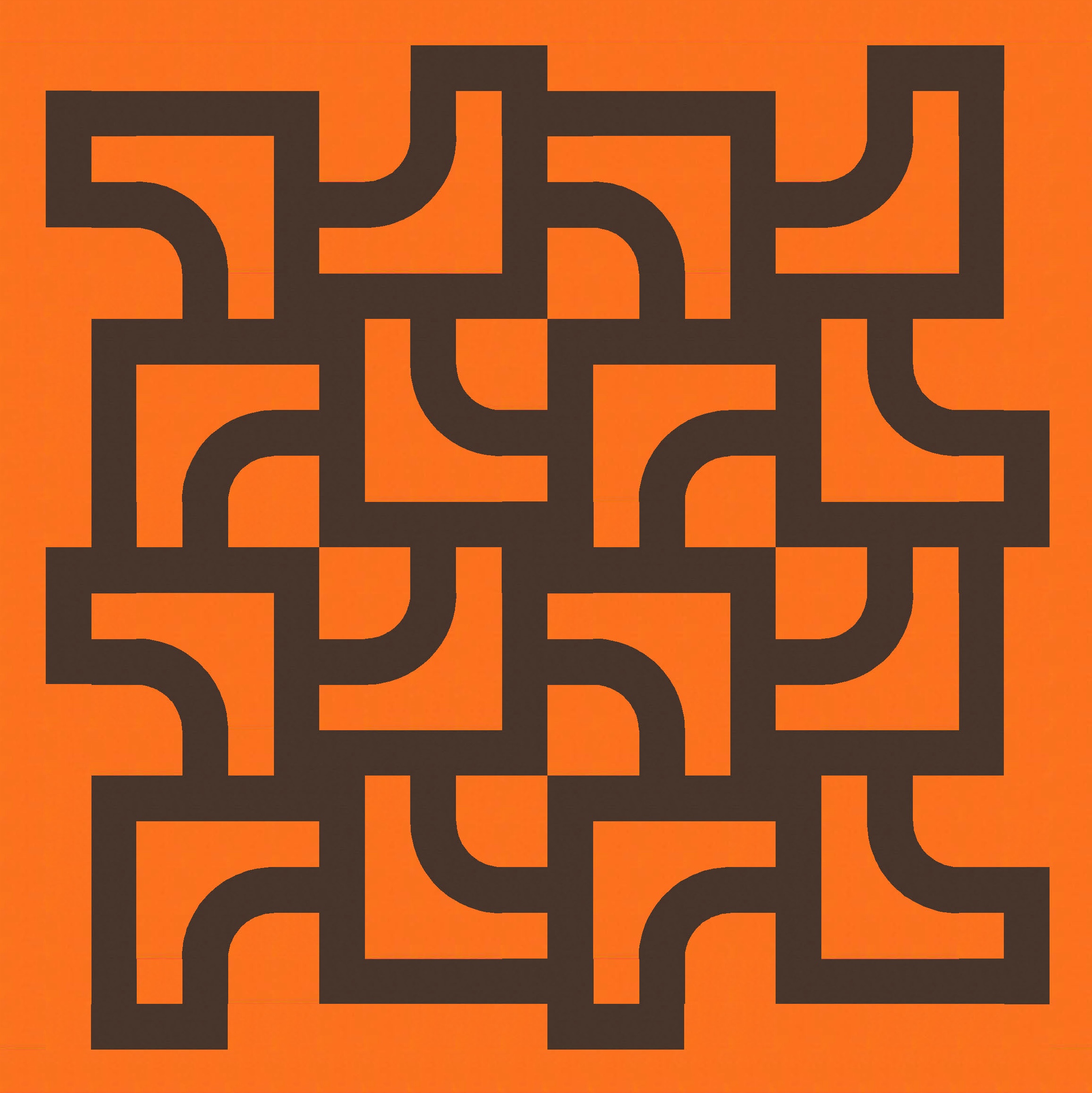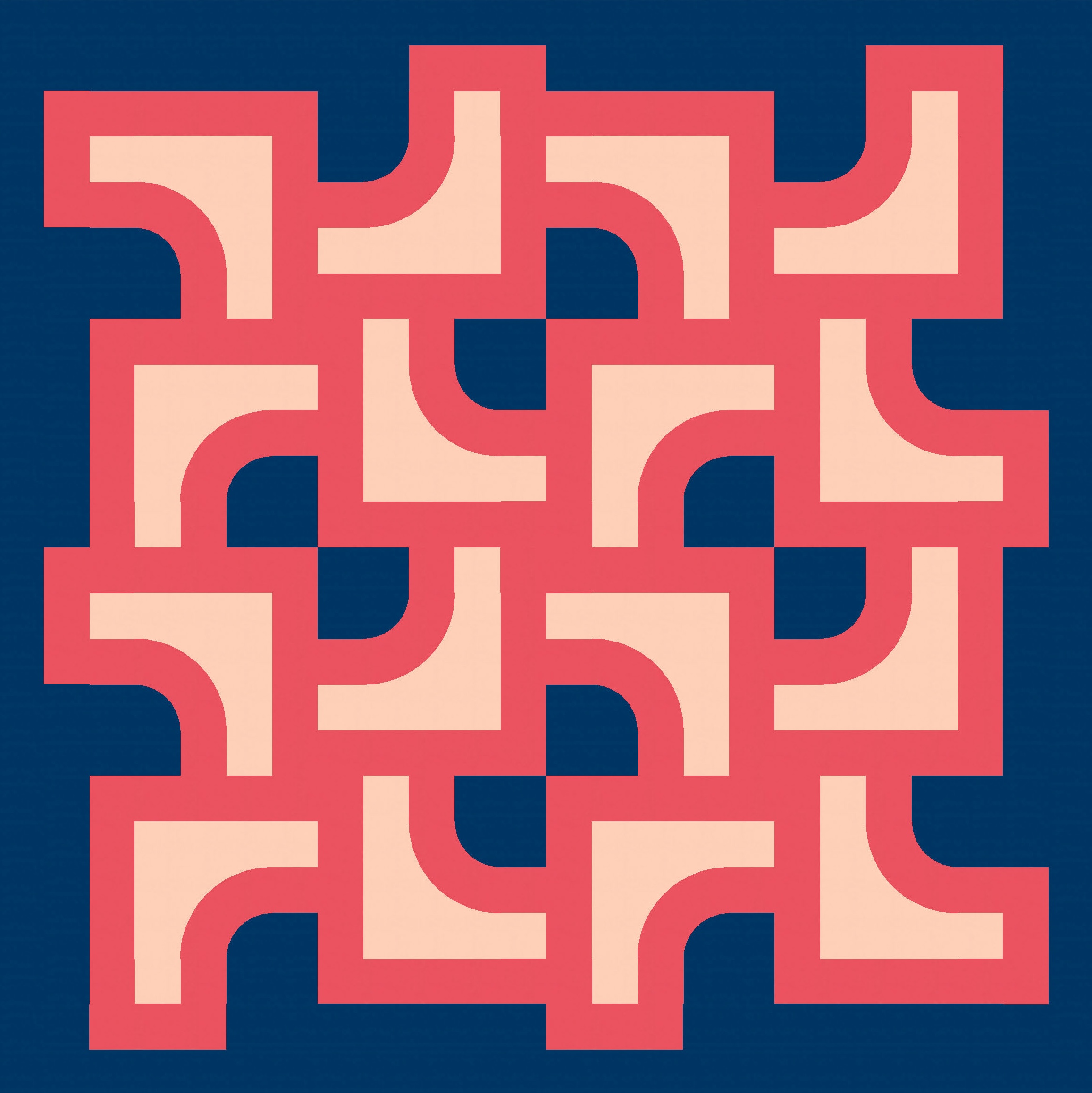 I’ve essentially just used those thick lines to outline a drunkard’s path unit at a larger scale, then tiled them. But rather than have solid edges butting up against one another, I’ve removed any adjacent thick lines (mostly). This gives the effect of the shapes overlapping each other. But the crowdedness and the oversized shapes lend a bit of chaos to an otherwise orderly design.