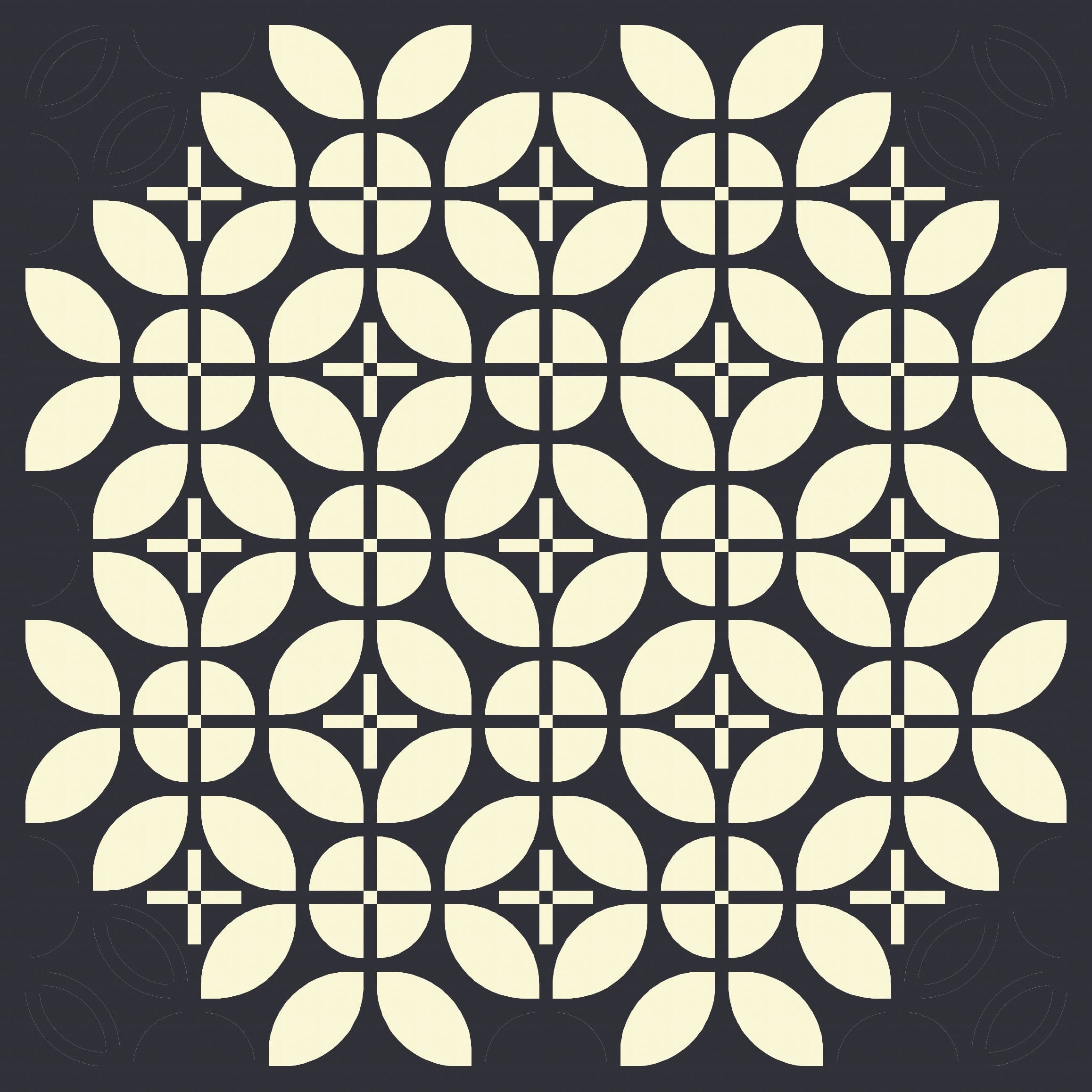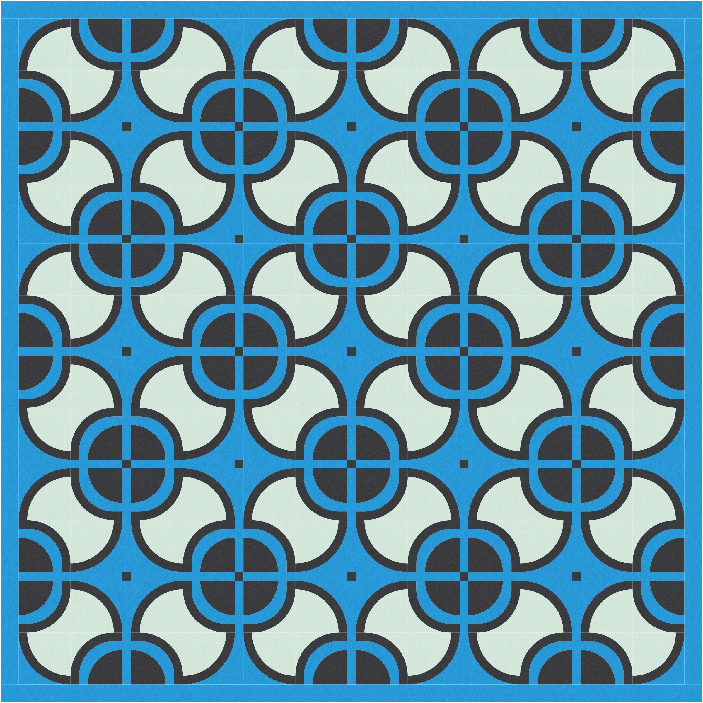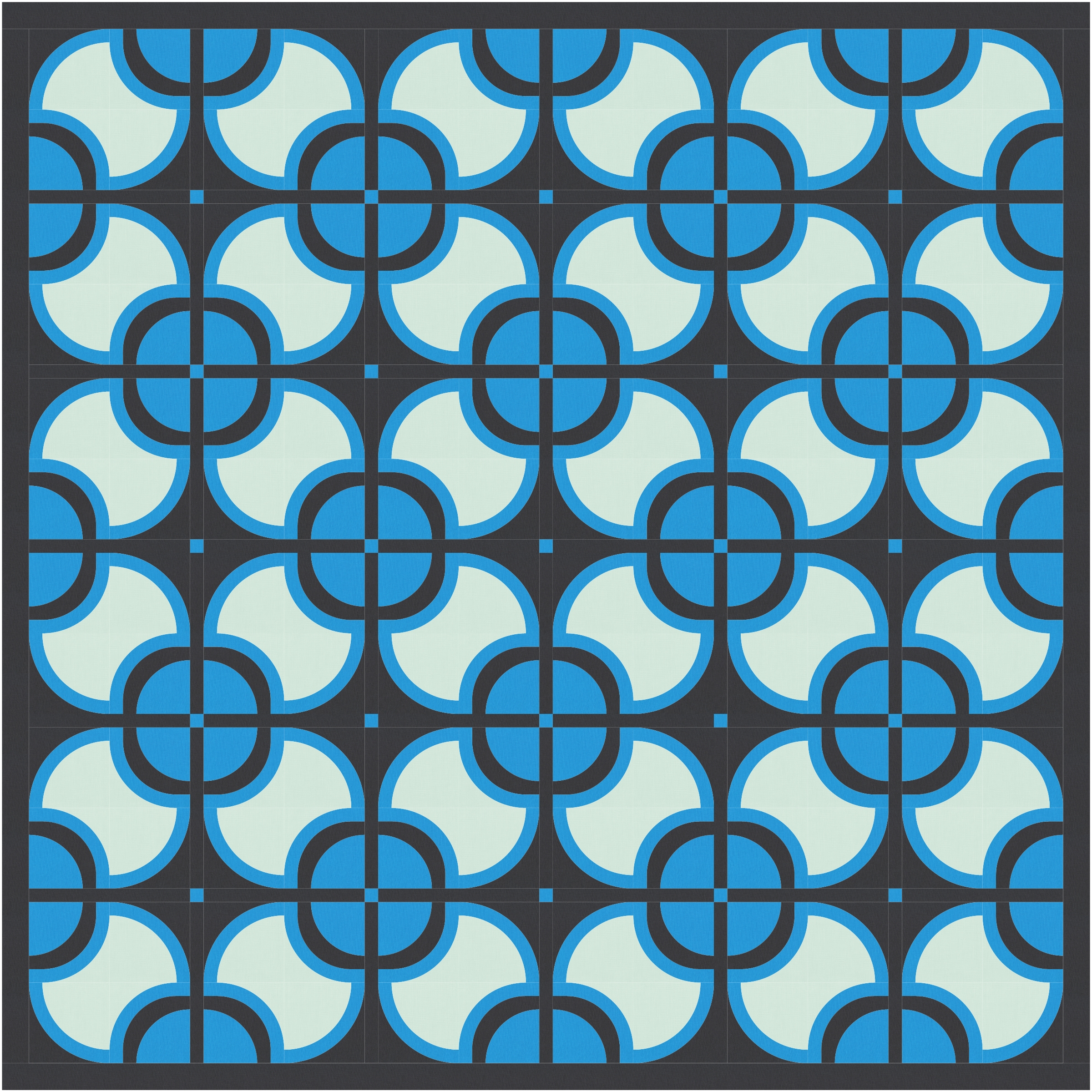 It was around this point that I started to think that the empty shapes between the blocks – where those small sashing cornerstones are floating alone in a sea of background colour – were just a little too empty. I tweaked the sashing to create some small crosses in those spaces, echoing the crosses that appear elsewhere in the design (within the circles that are created by the solid quarter-circles from four adjacent blocks). I’ve reversed the colouring too: whereas the crosses in the circles are in the background colour, with the cornerstone in the same colour as the circles, the other crosses are in the solid colour, with the cornerstone in the same colour as the background. The two types of crosses aren’t exactly the same size, but close enough. Overall, I think this feels much better!