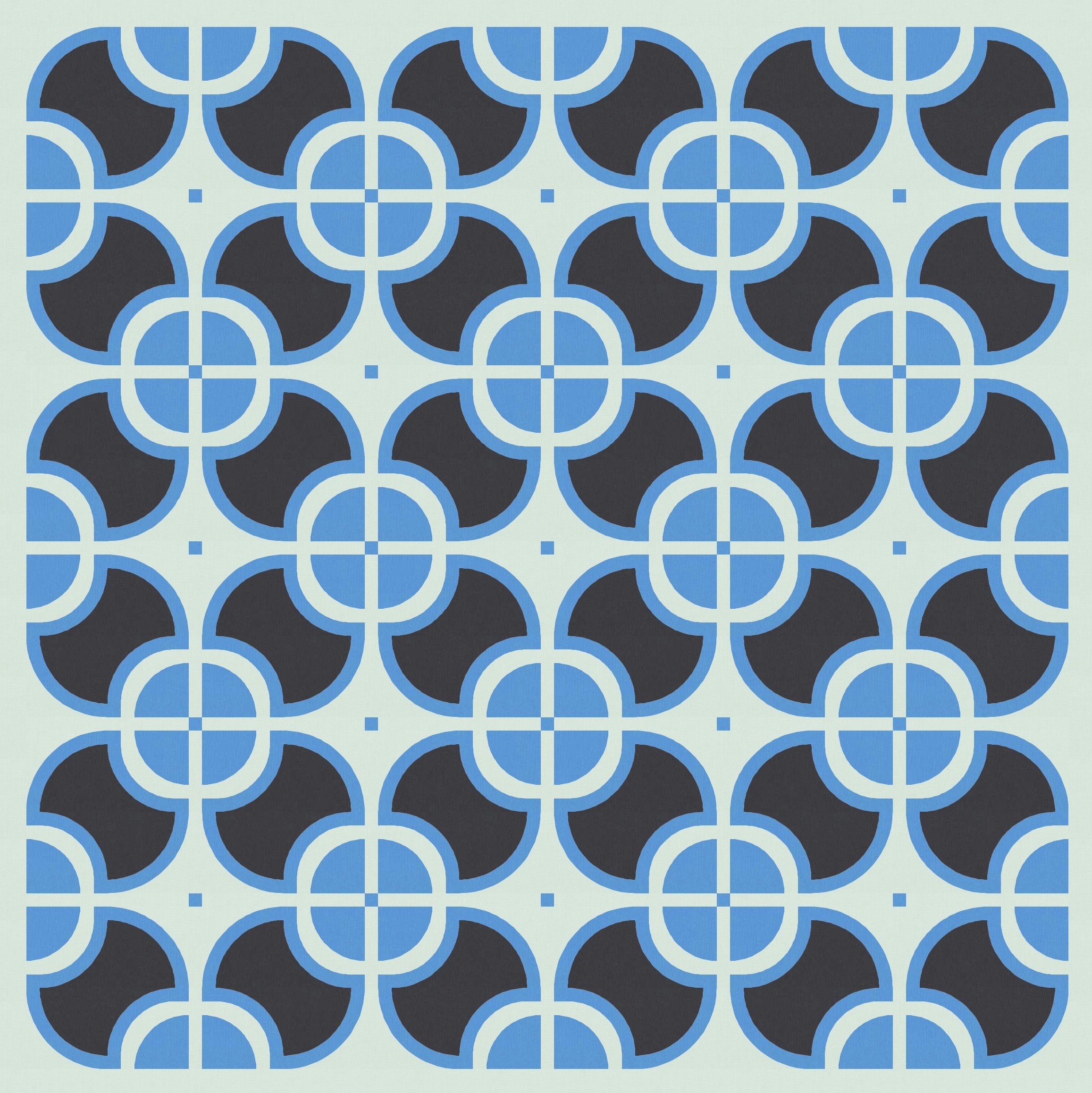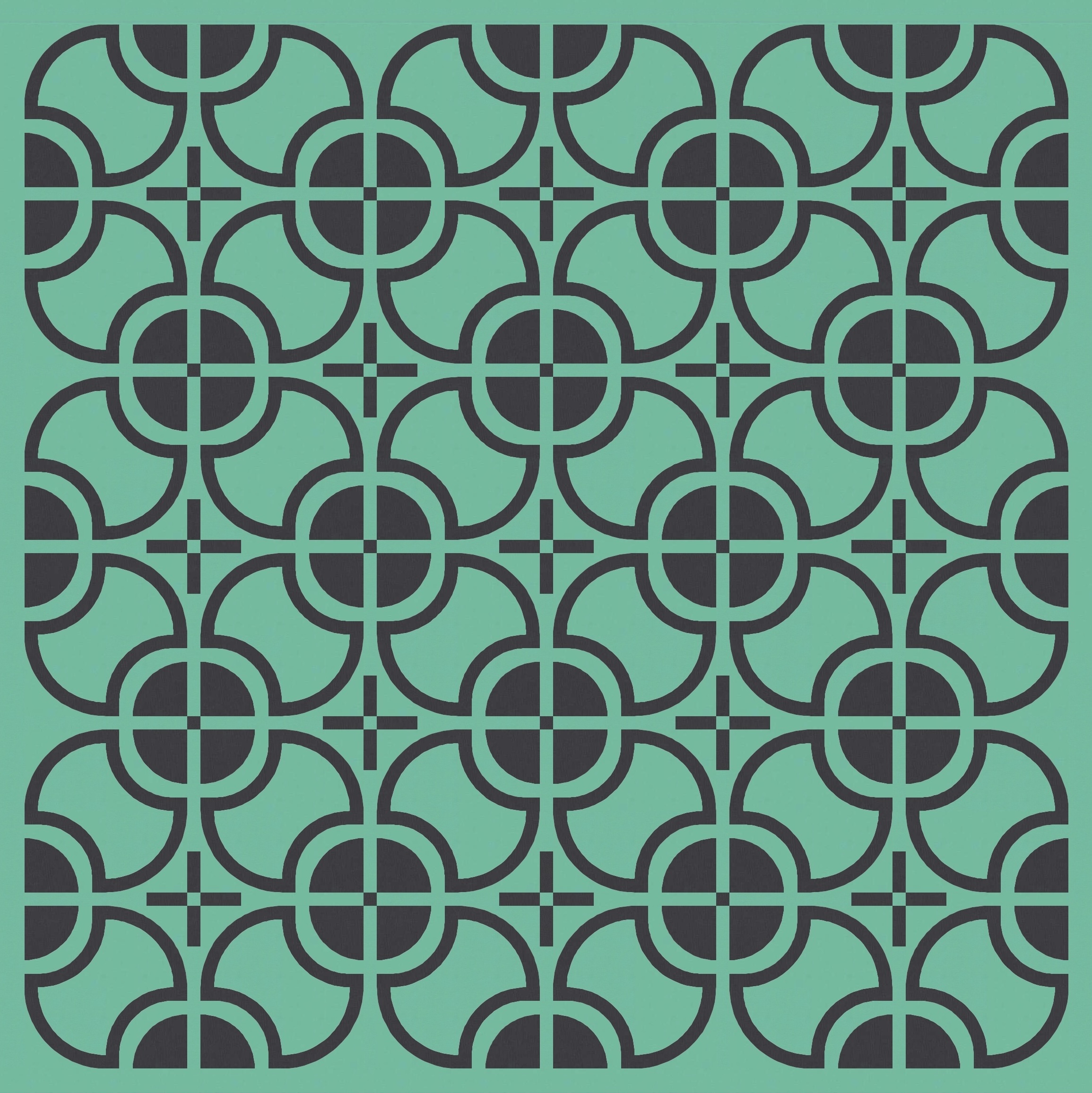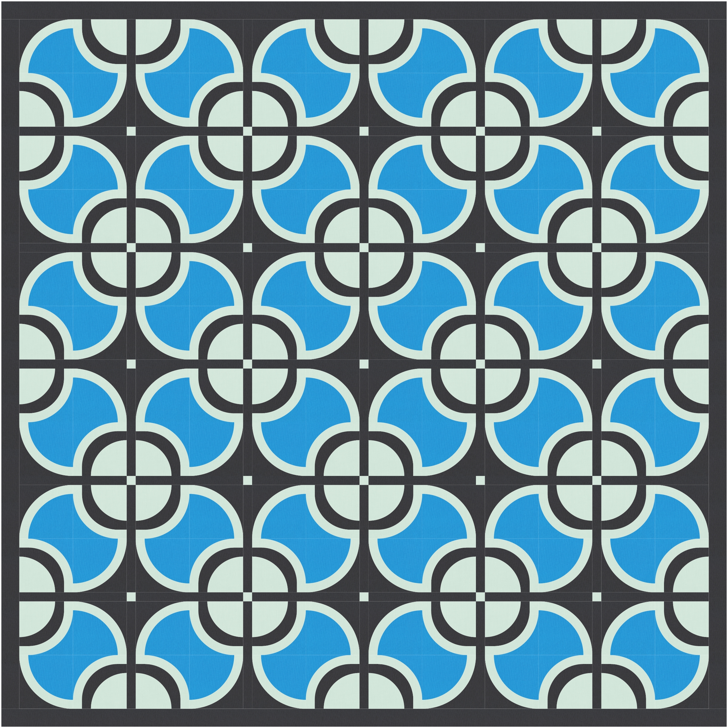 It was around this point that I started to think that the empty shapes between the blocks – where those small sashing cornerstones are floating alone in a sea of background colour – were just a little too empty. I tweaked the sashing to create some small crosses in those spaces, echoing the crosses that appear elsewhere in the design (within the circles that are created by the solid quarter-circles from four adjacent blocks). I’ve reversed the colouring too: whereas the crosses in the circles are in the background colour, with the cornerstone in the same colour as the circles, the other crosses are in the solid colour, with the cornerstone in the same colour as the background. The two types of crosses aren’t exactly the same size, but close enough. Overall, I think this feels much better!