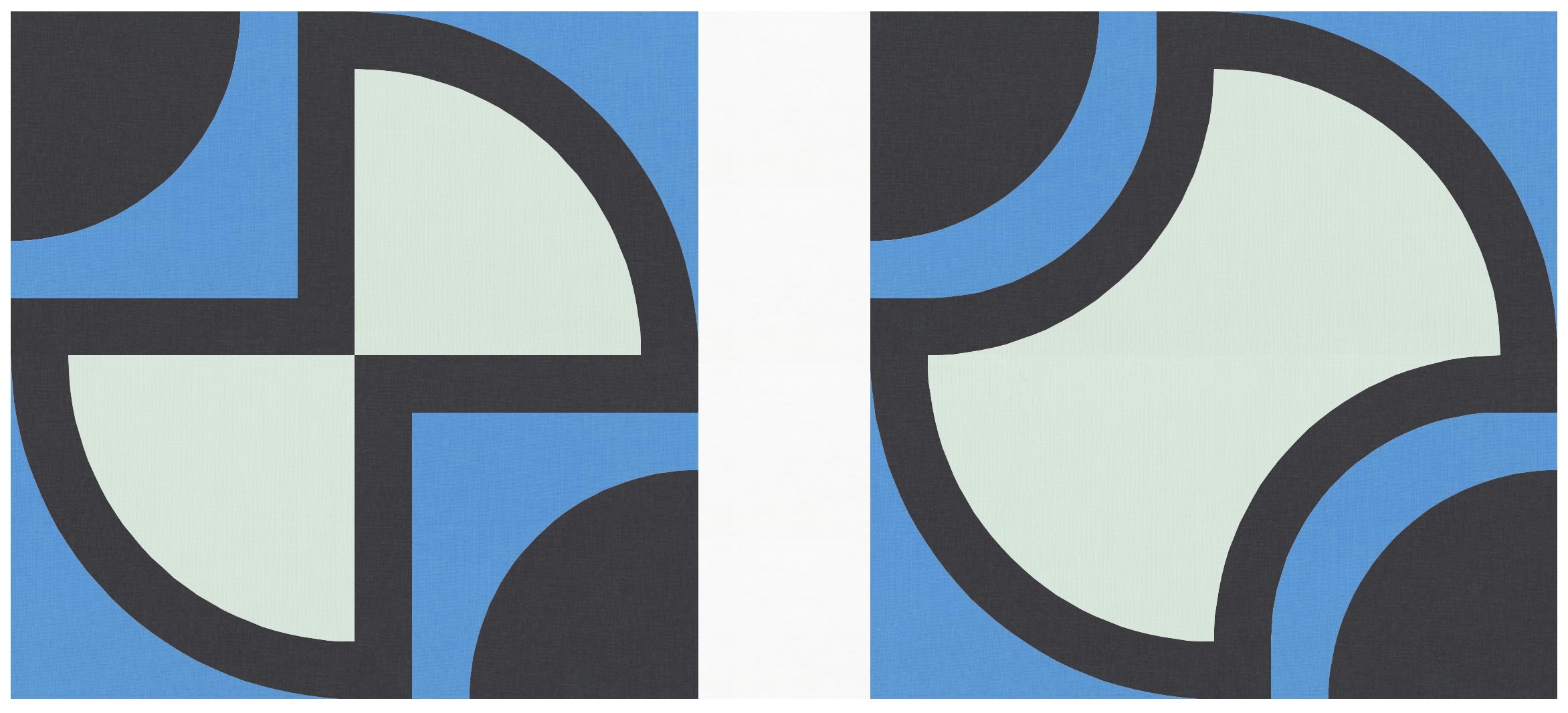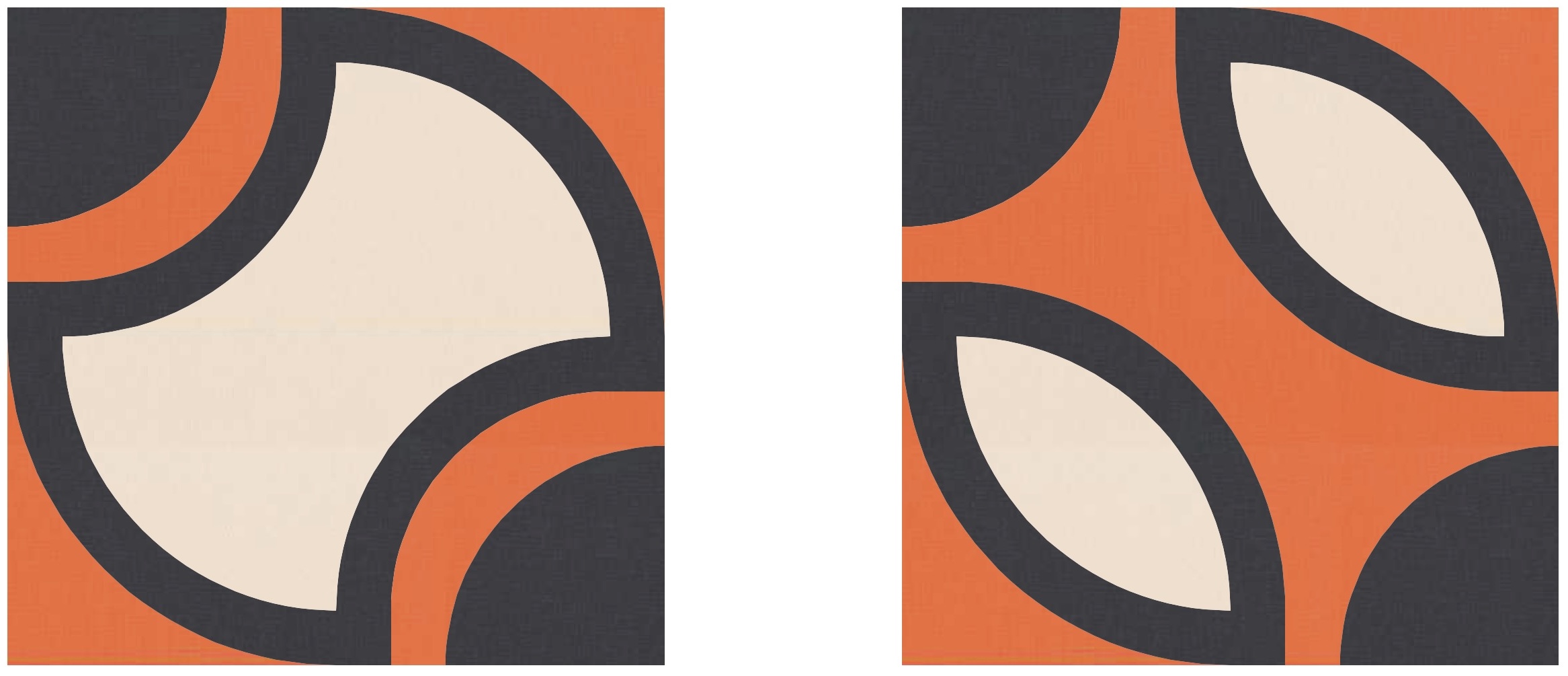 You might notice that the two curves in the corners of the blocks aren’t concentric – because of the way I’ve designed the block, they’re a little off. The convex curve of the solid drunkard’s path / quarter-circle doesn’t fit perfectly into the concave side border of the inner apple-core shape.