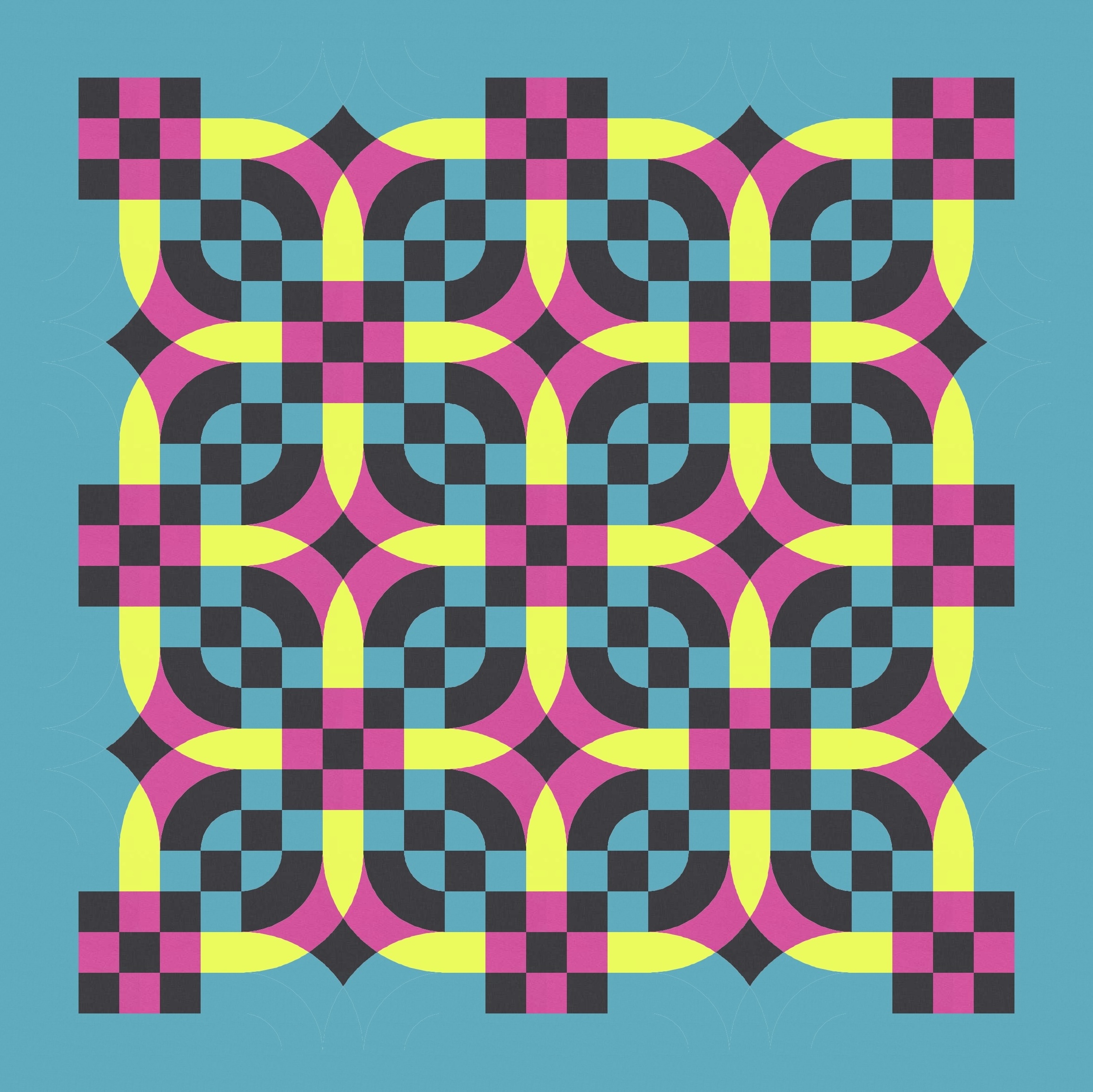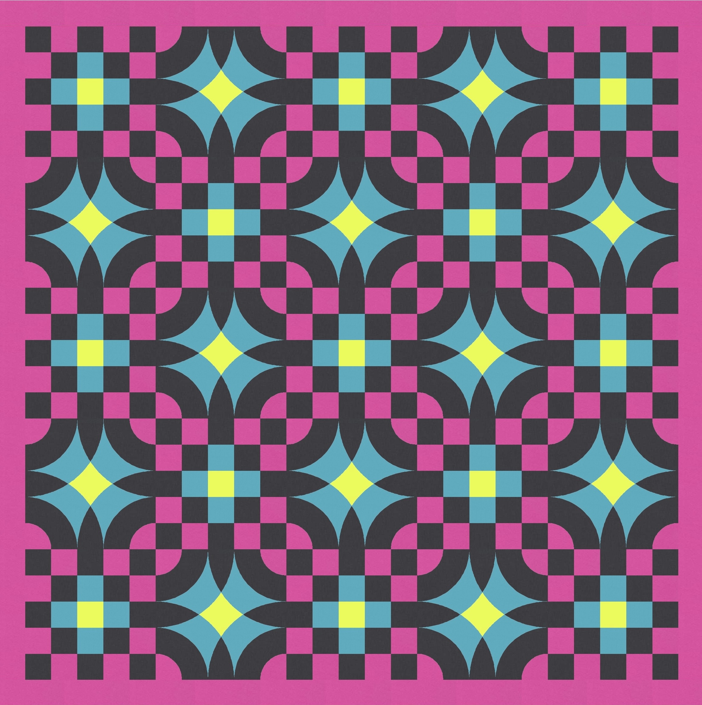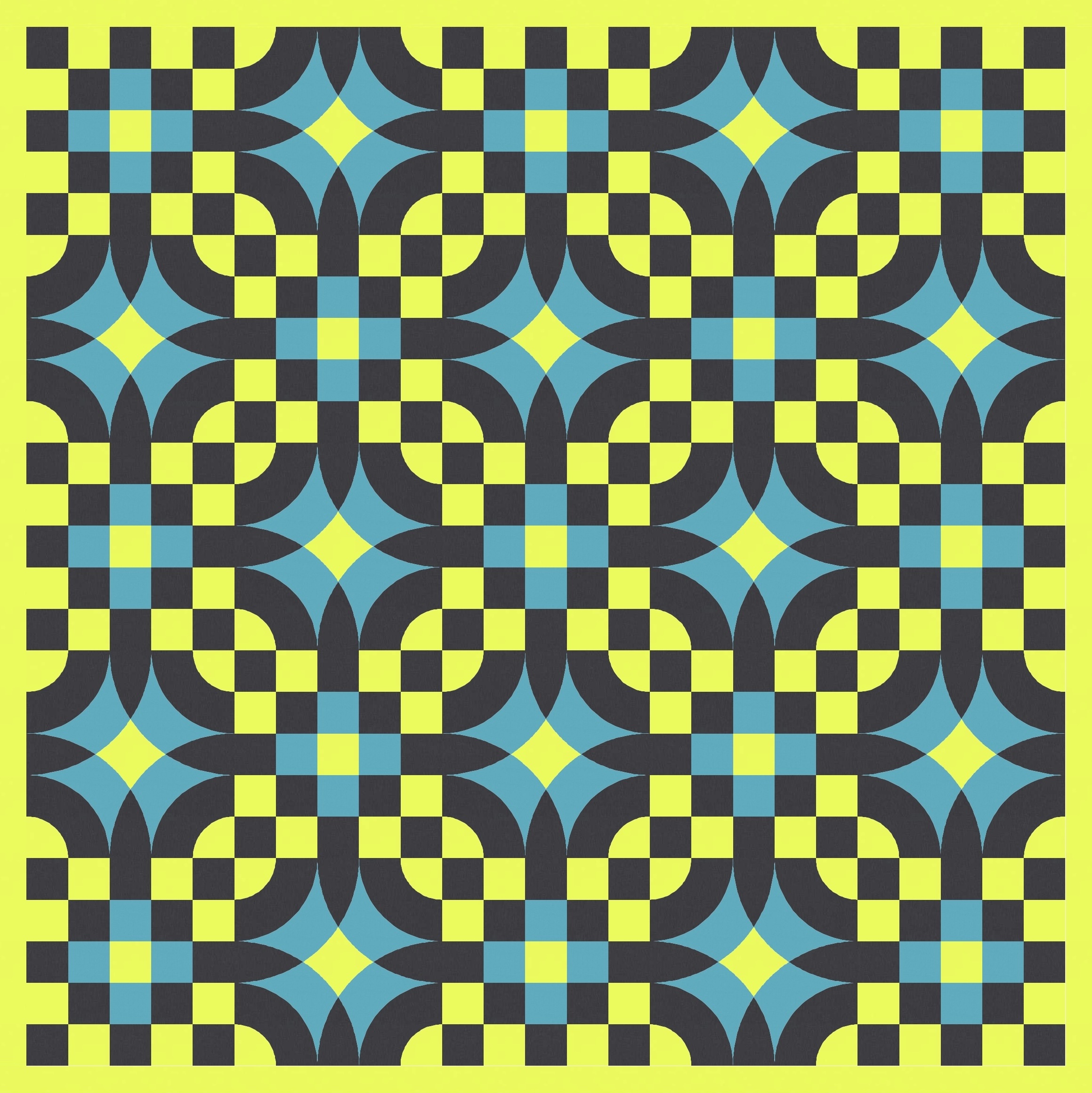 These designs could be made into a quilt using a standard twenty-five patch block of squares, along with another block of overlapping curves. That second block would undoubtedly require templates… I think probably there’d be a way to create blocks with concentric (double drunkard’s path) curves and then subcut them and piece them together to create the final block. Jenny Haynes (Papper, Sax, Sten) does a lot of that kind of thing in her own work (see, for example, her Pond Skater and Havsglas quilts) and workshops, so check her out if you haven’t already!