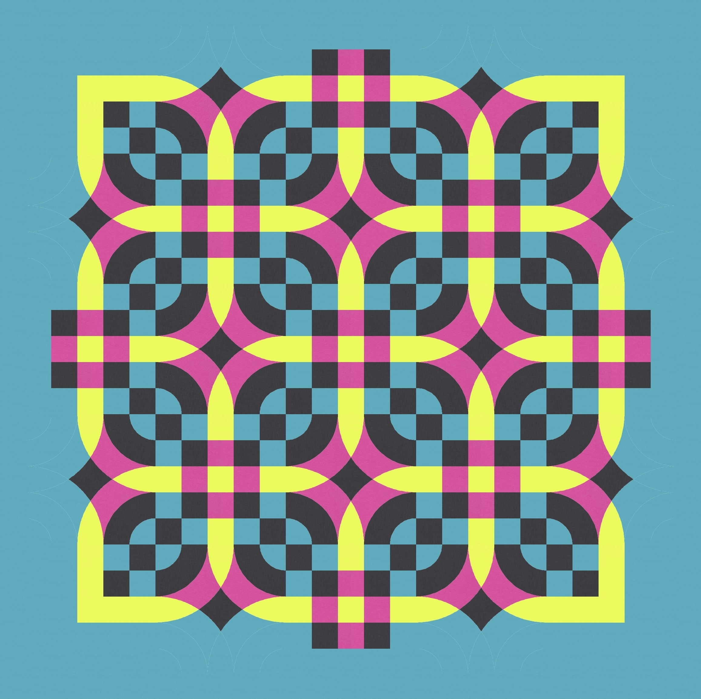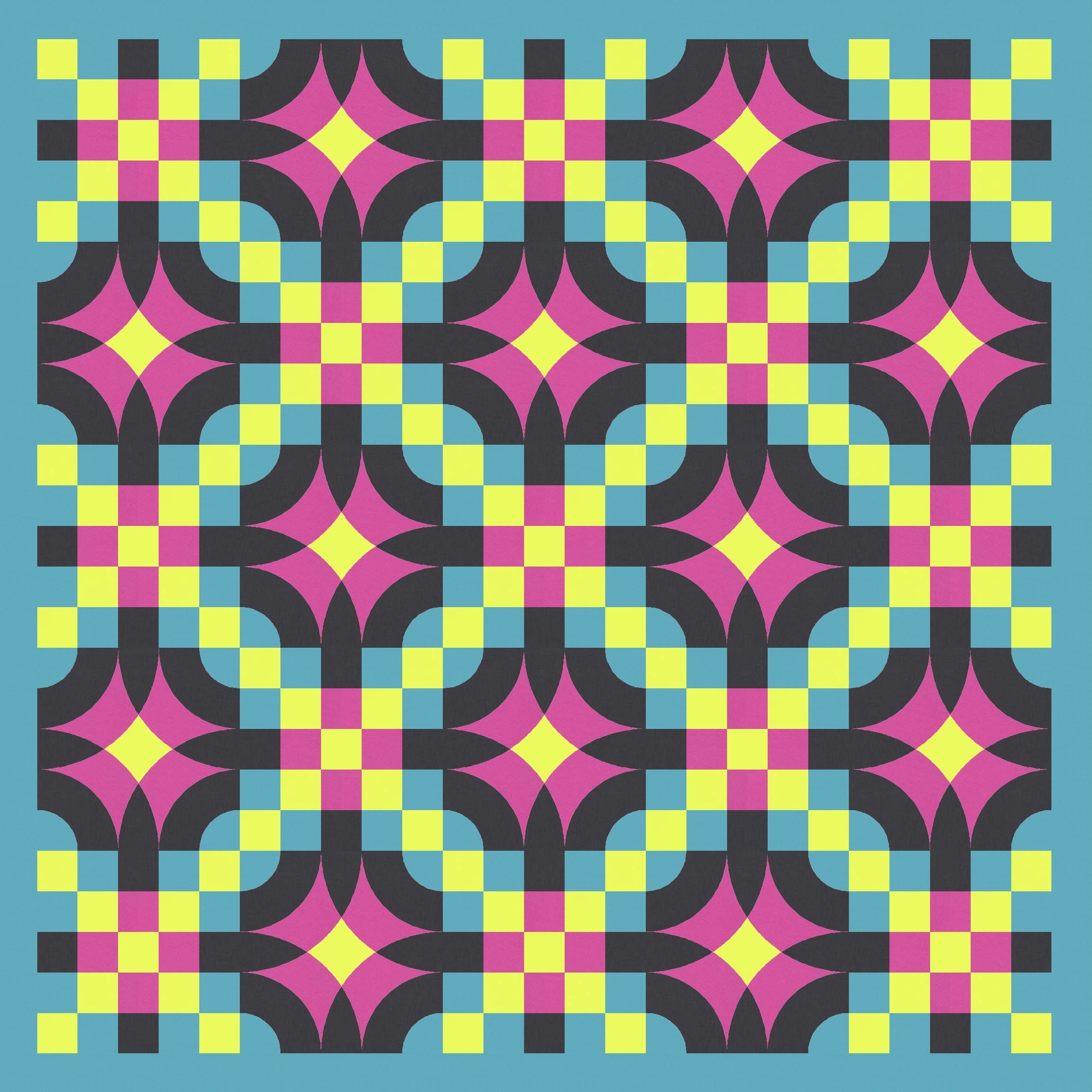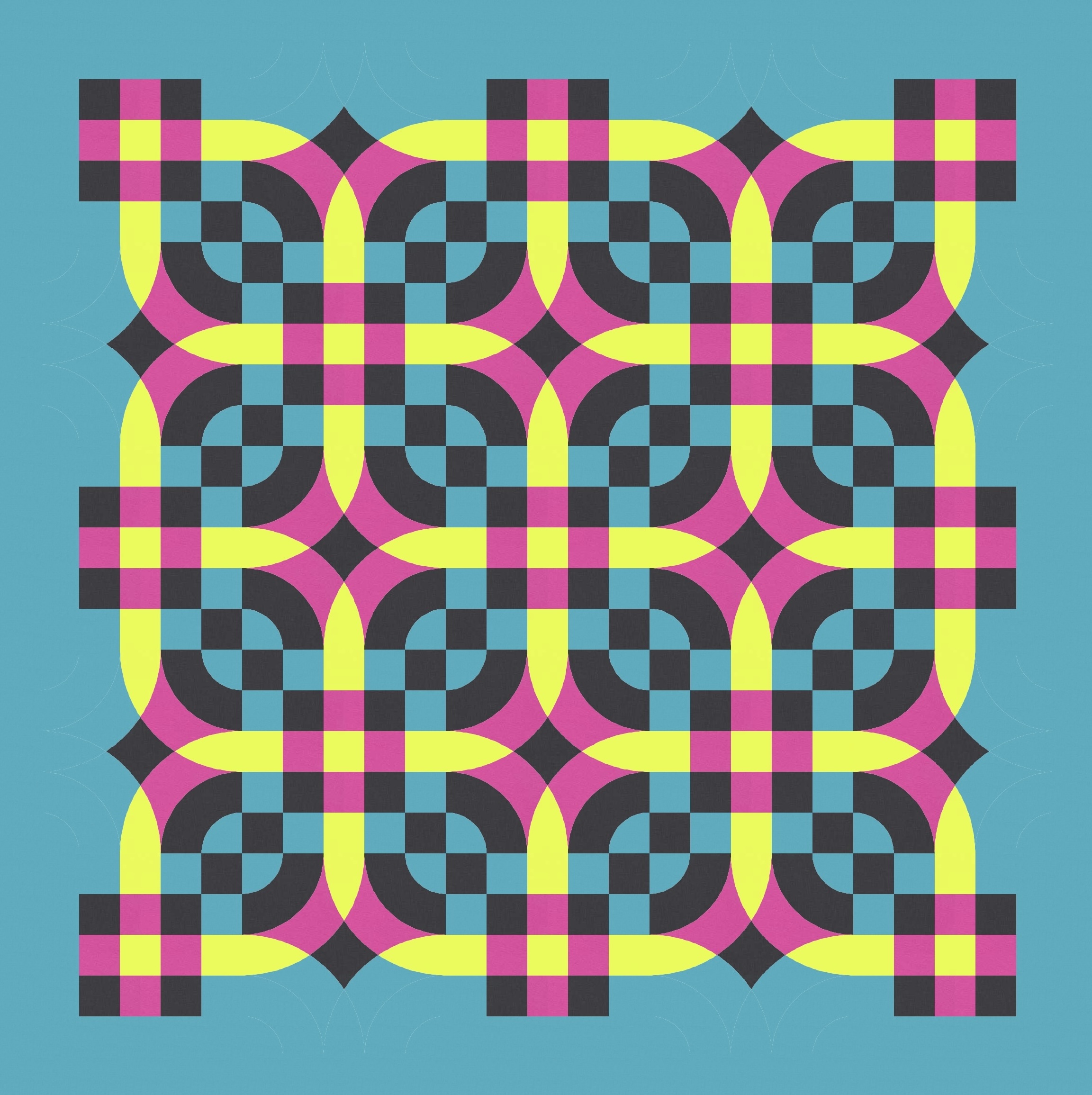 These designs could be made into a quilt using a standard twenty-five patch block of squares, along with another block of overlapping curves. That second block would undoubtedly require templates… I think probably there’d be a way to create blocks with concentric (double drunkard’s path) curves and then subcut them and piece them together to create the final block. Jenny Haynes (Papper, Sax, Sten) does a lot of that kind of thing in her own work (see, for example, her Pond Skater and Havsglas quilts) and workshops, so check her out if you haven’t already!