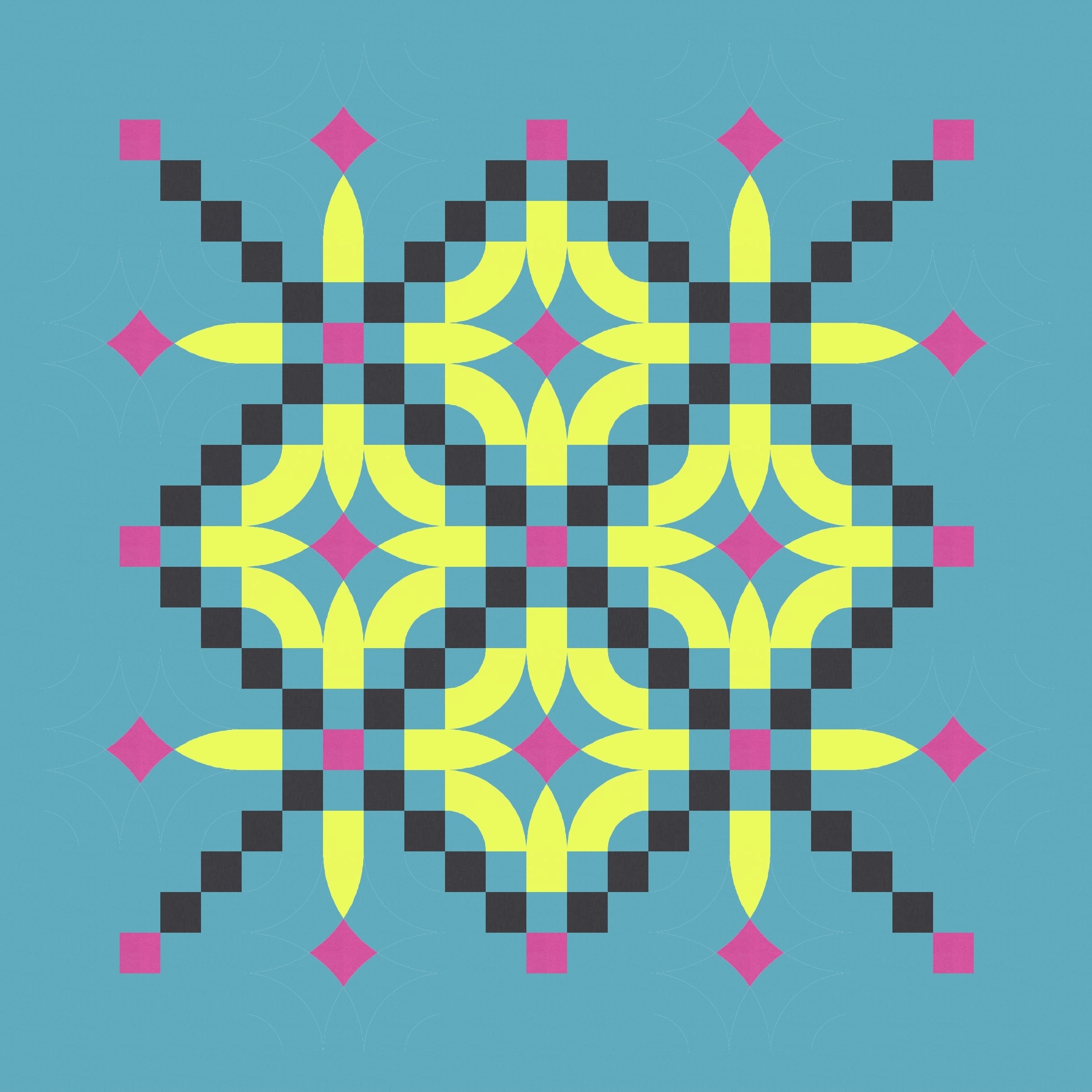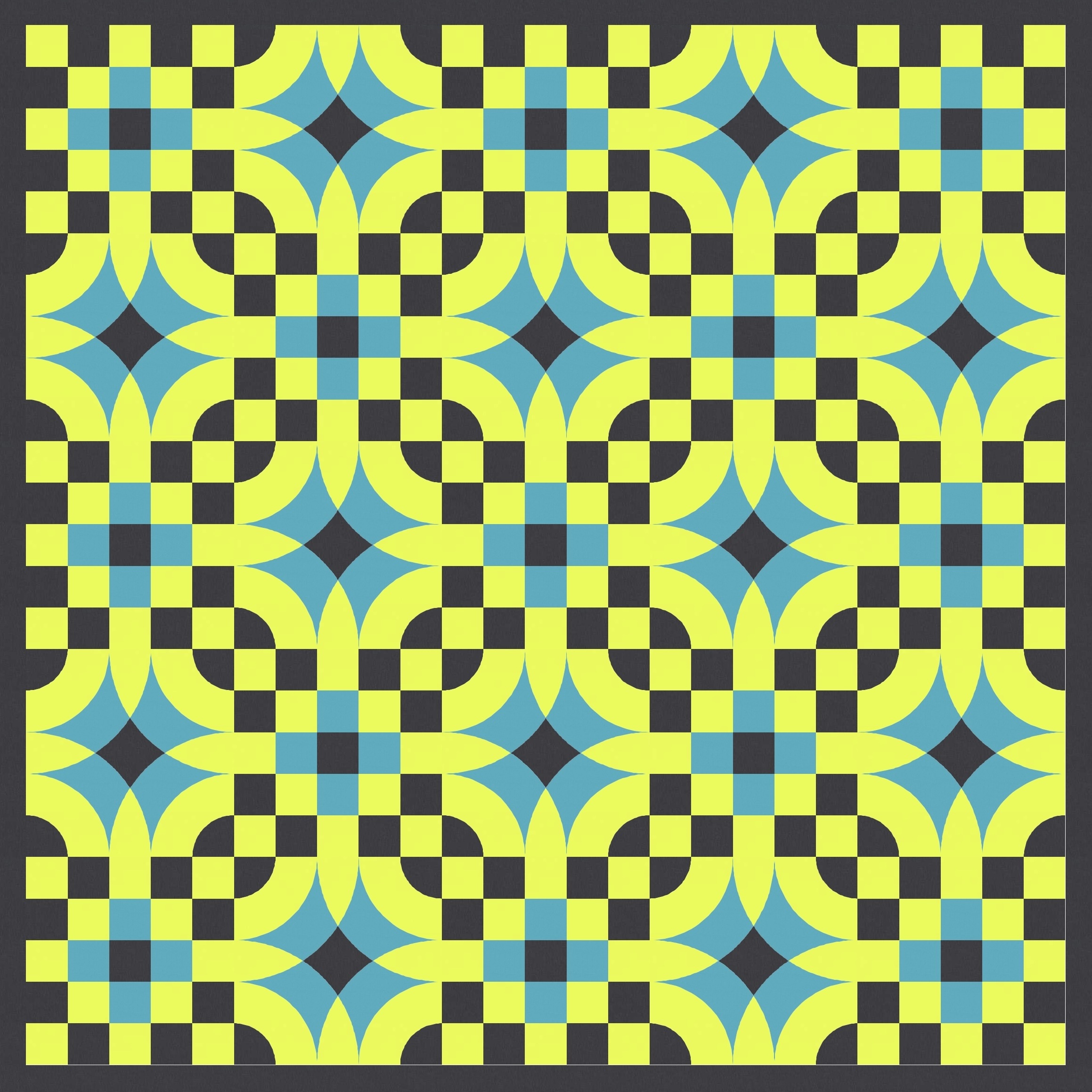Last week’s sketch was inspired by a traditional Irish chain quilt design. This week’s is too, with a few modifications. First, instead of a nine-patch, I’ve used a twenty-five-patch. (If you’re wondering why I jumped past the sixteen-patch, it’s because using patches with an odd number of squares lets me keep the four corner squares in the same colour in a two-colour design (otherwise two would be in one colour and two would be in the other colour).) I included some curves (like last week) but added in some more, with overlaps to create new secondary shapes.