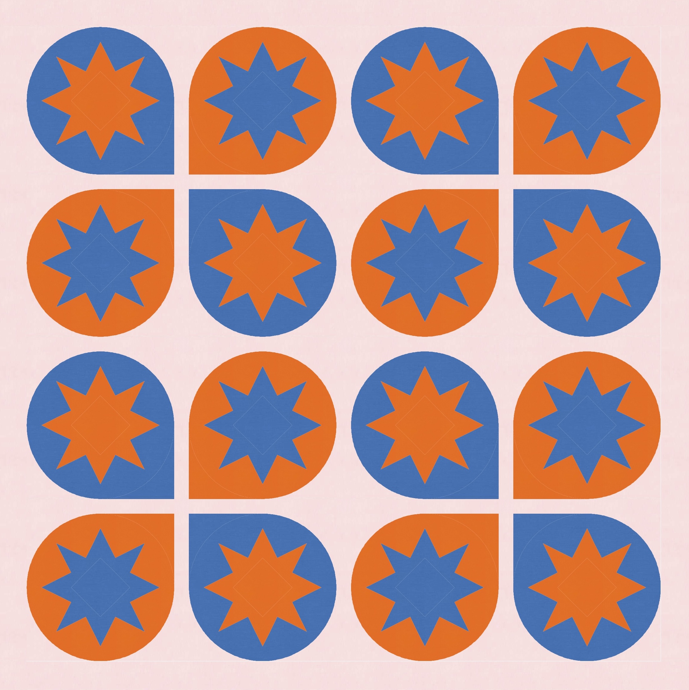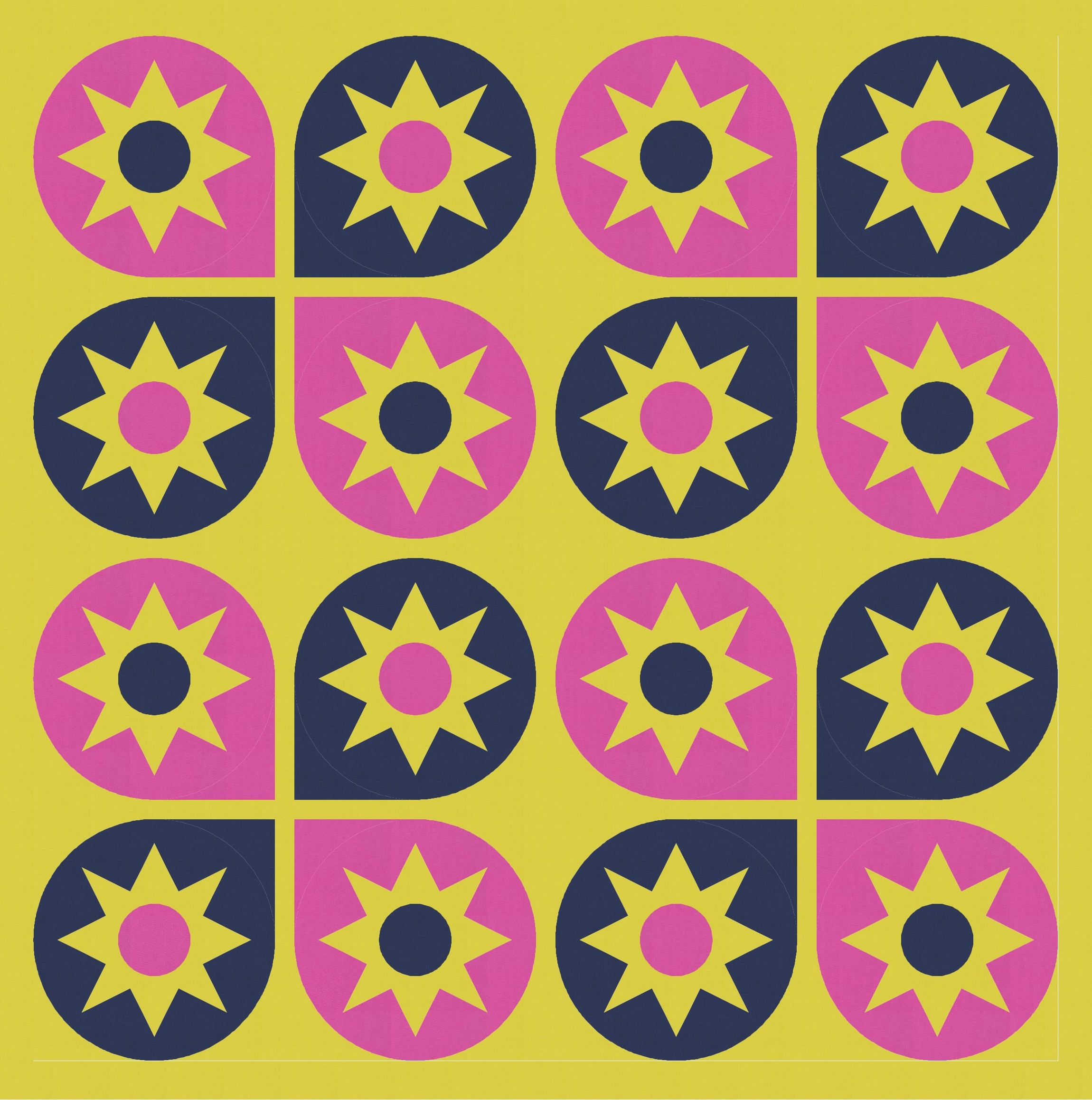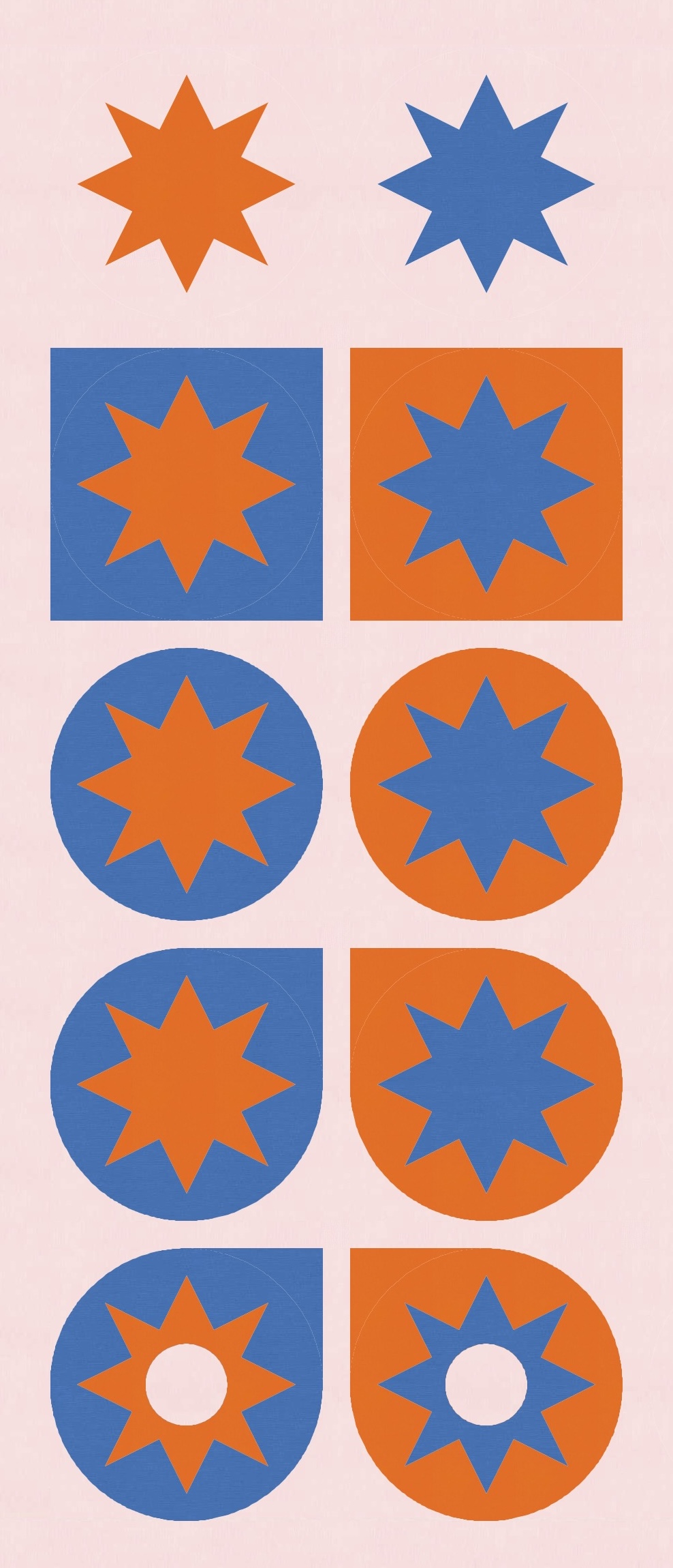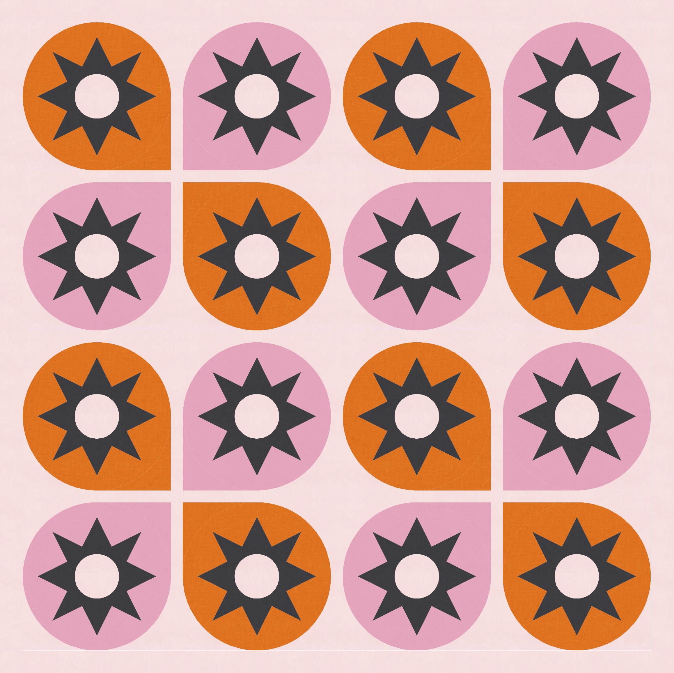 So far, I’ve coloured the star differently in each block and used the centre circle as the shared colour (same as the background colour) across all blocks. But I also like the effect of making the star the shared colour, with the centre circles coloured in the background instead. The stars really pop out in this version (and they give me slight Clockwork Orange vibes.)
