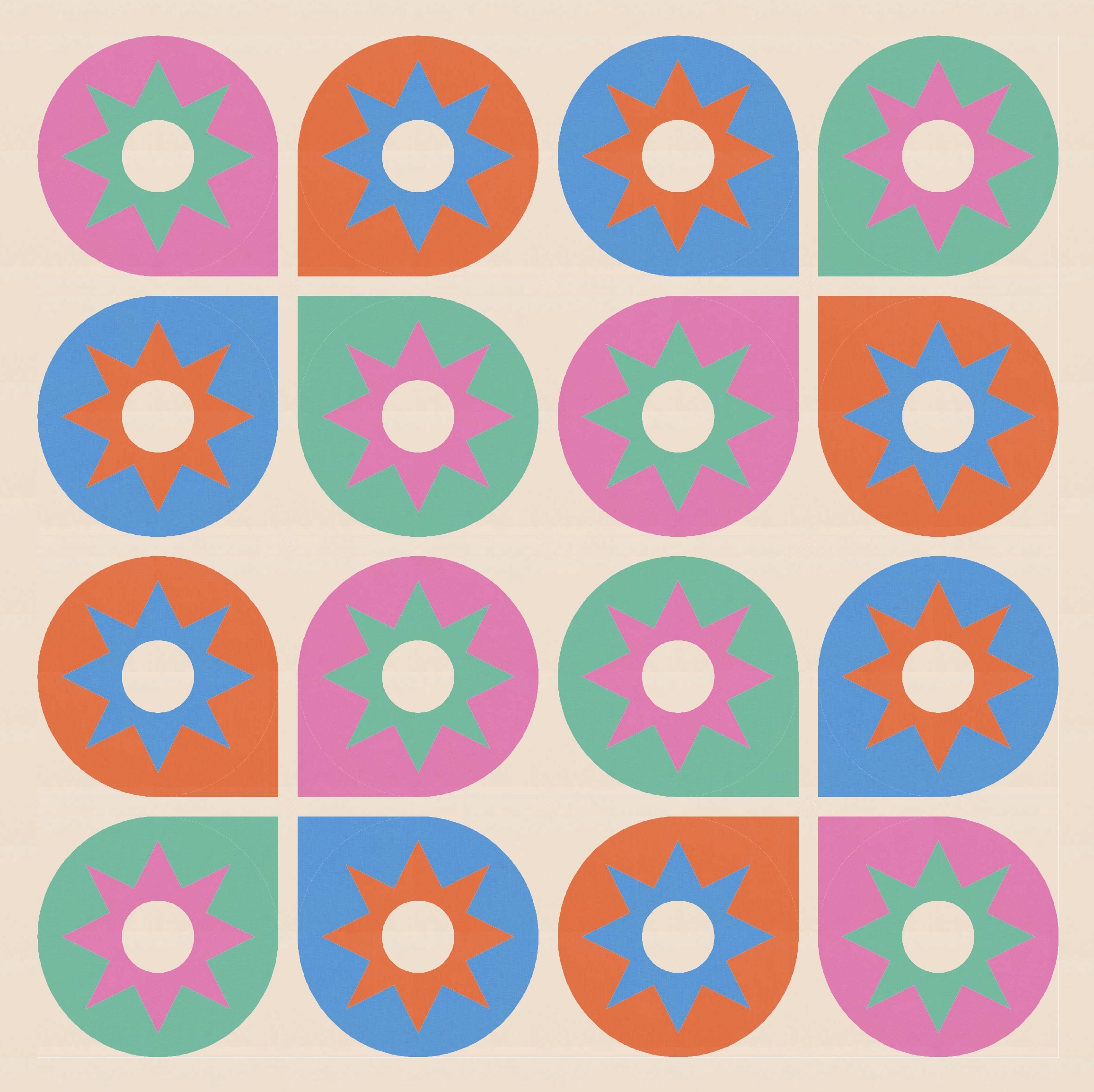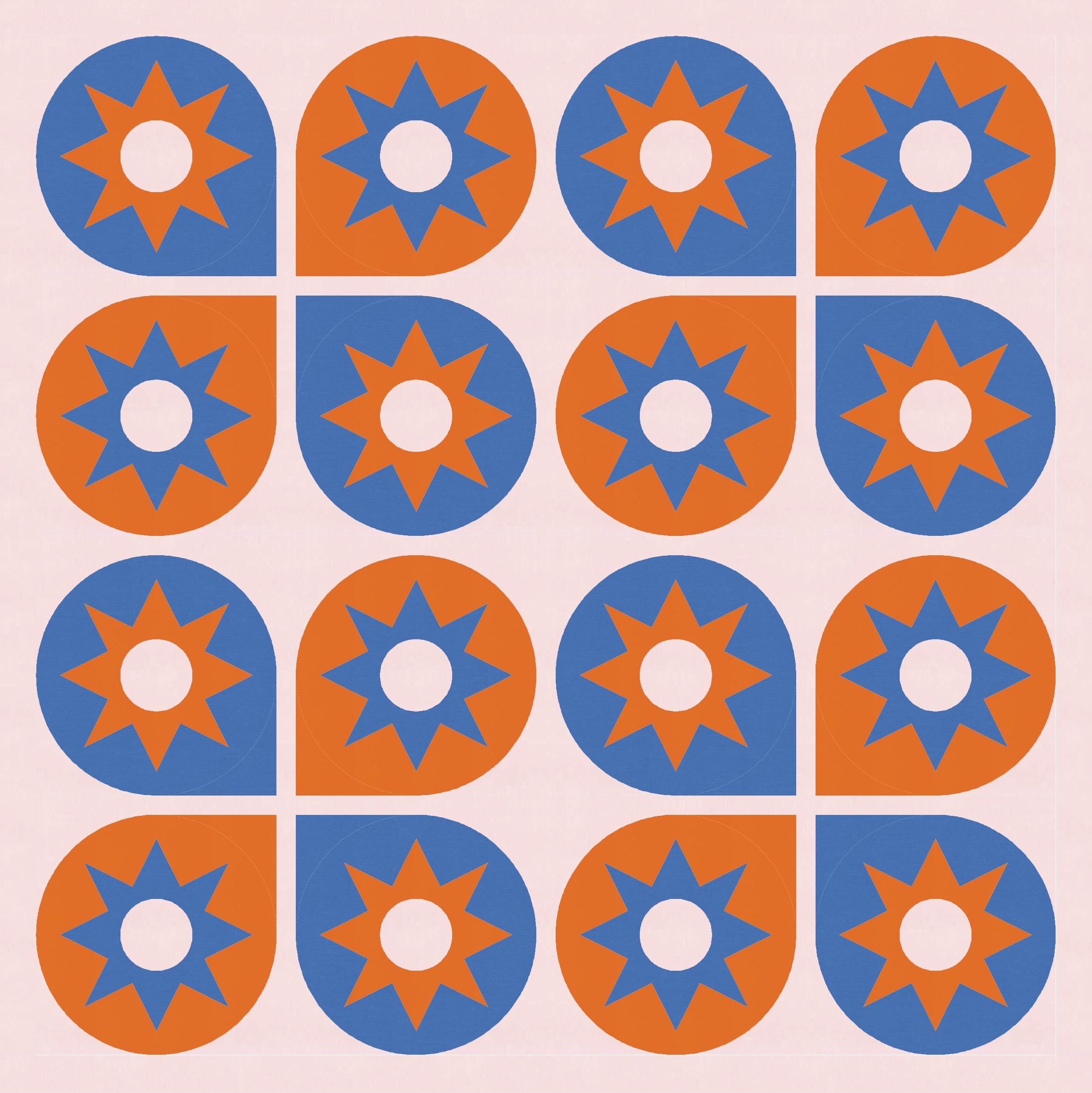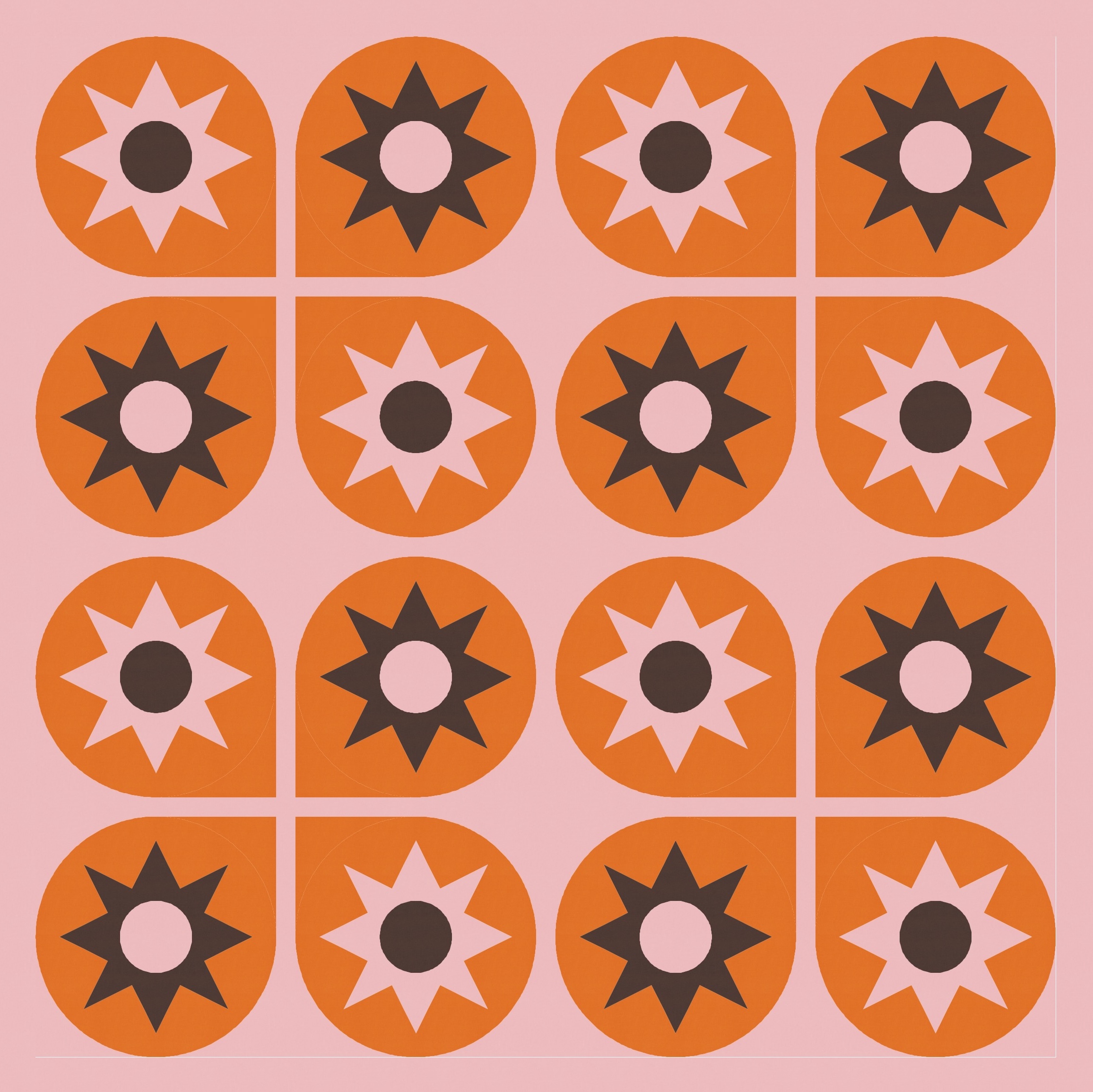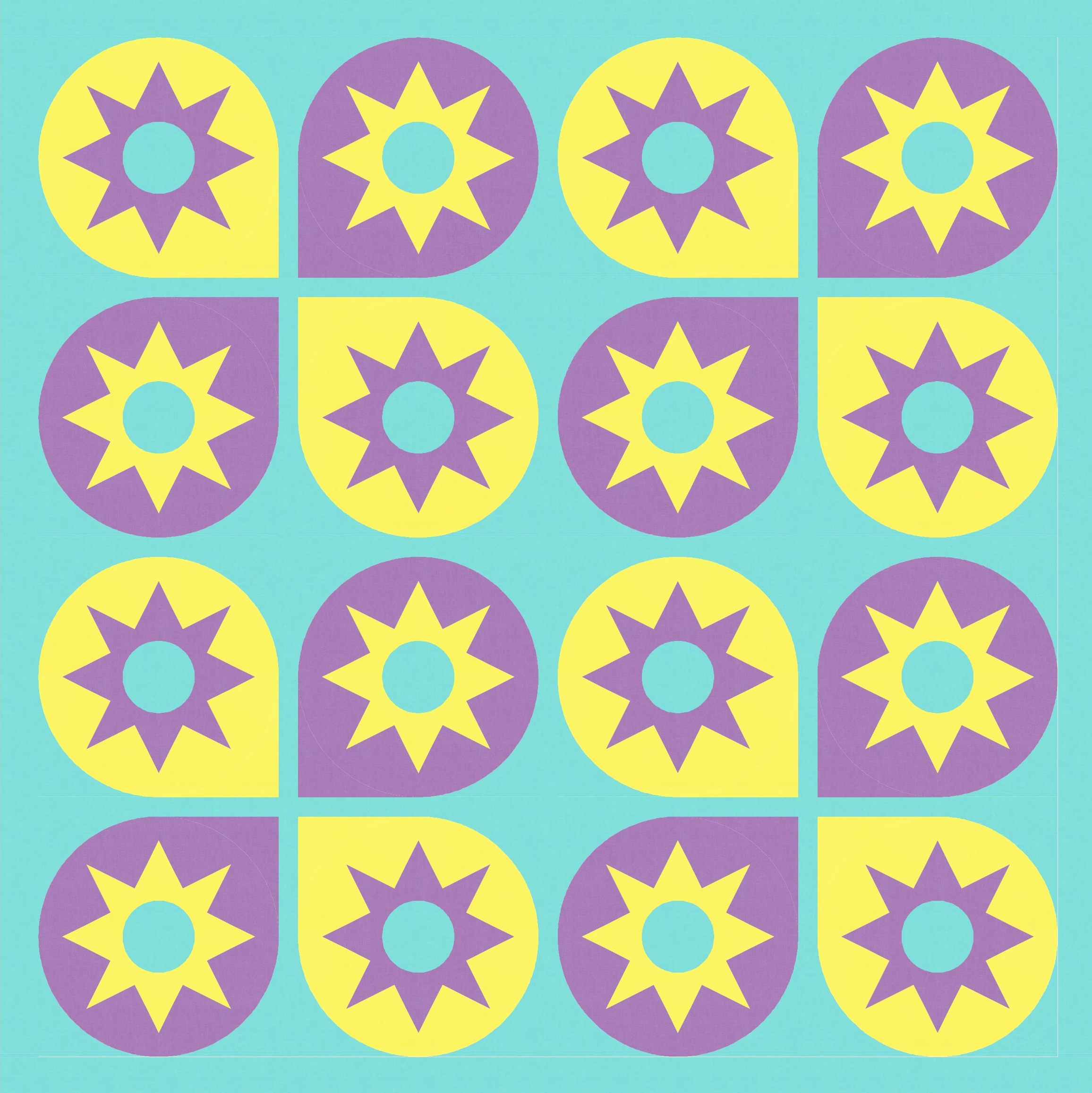 So far, I’ve coloured the star differently in each block and used the centre circle as the shared colour (same as the background colour) across all blocks. But I also like the effect of making the star the shared colour, with the centre circles coloured in the background instead. The stars really pop out in this version (and they give me slight Clockwork Orange vibes.)