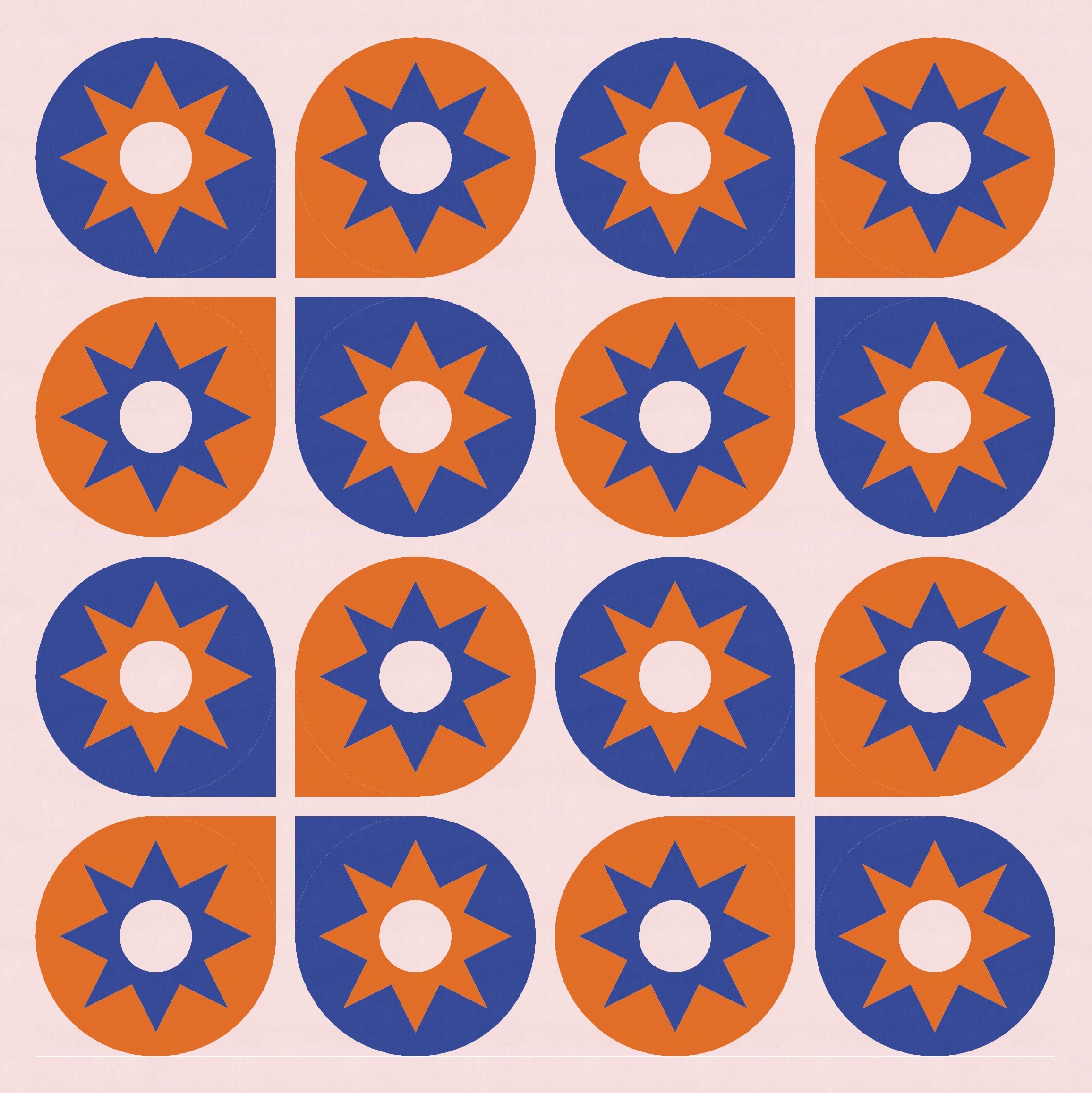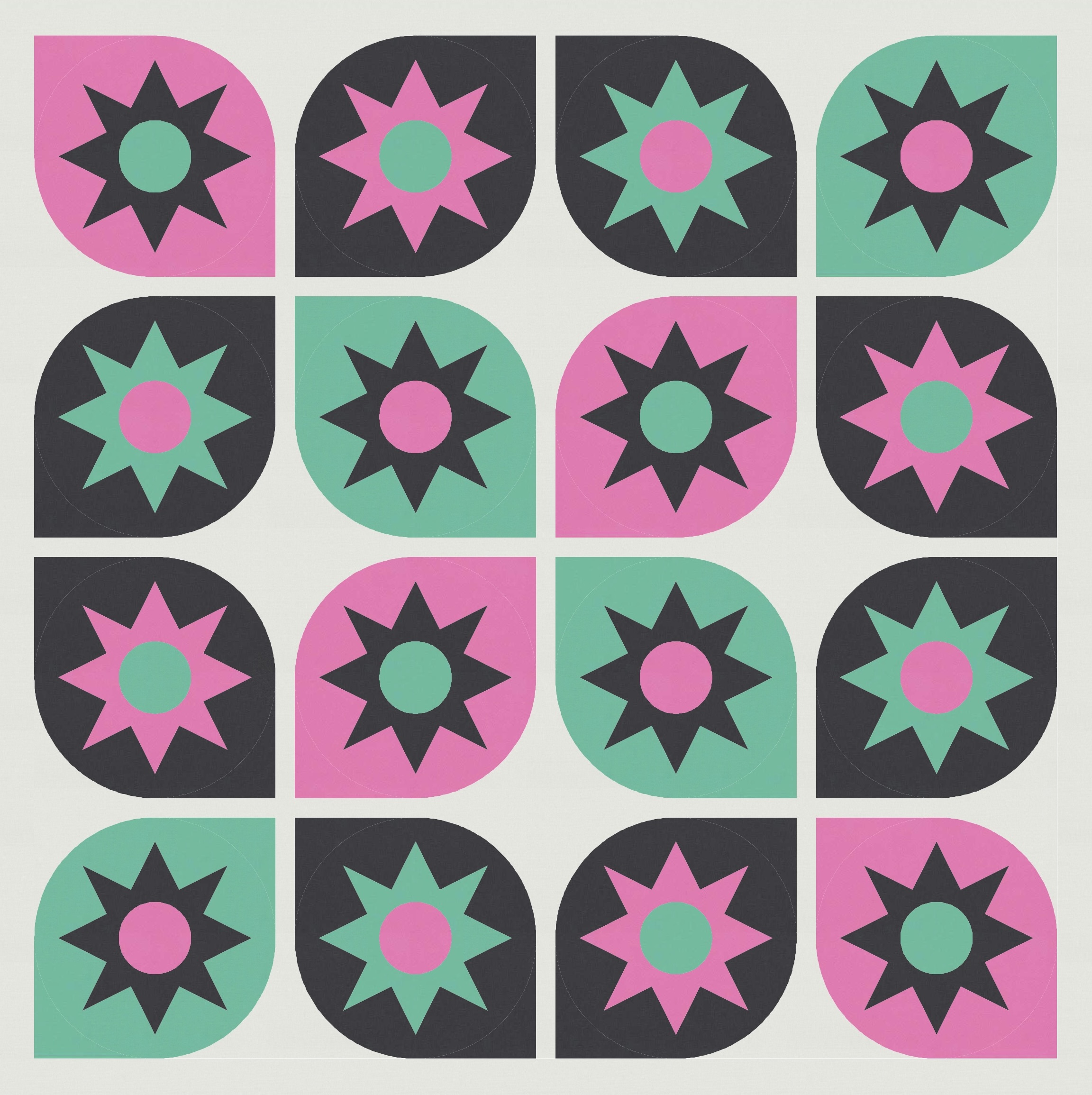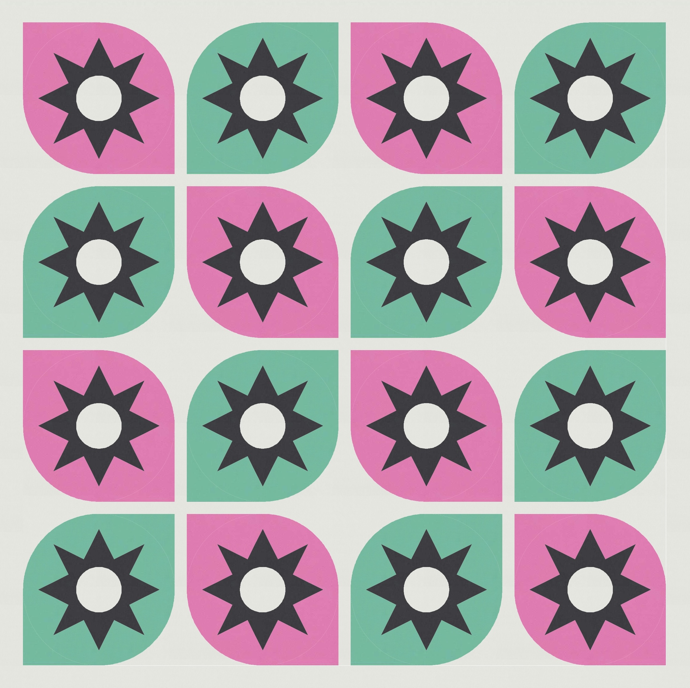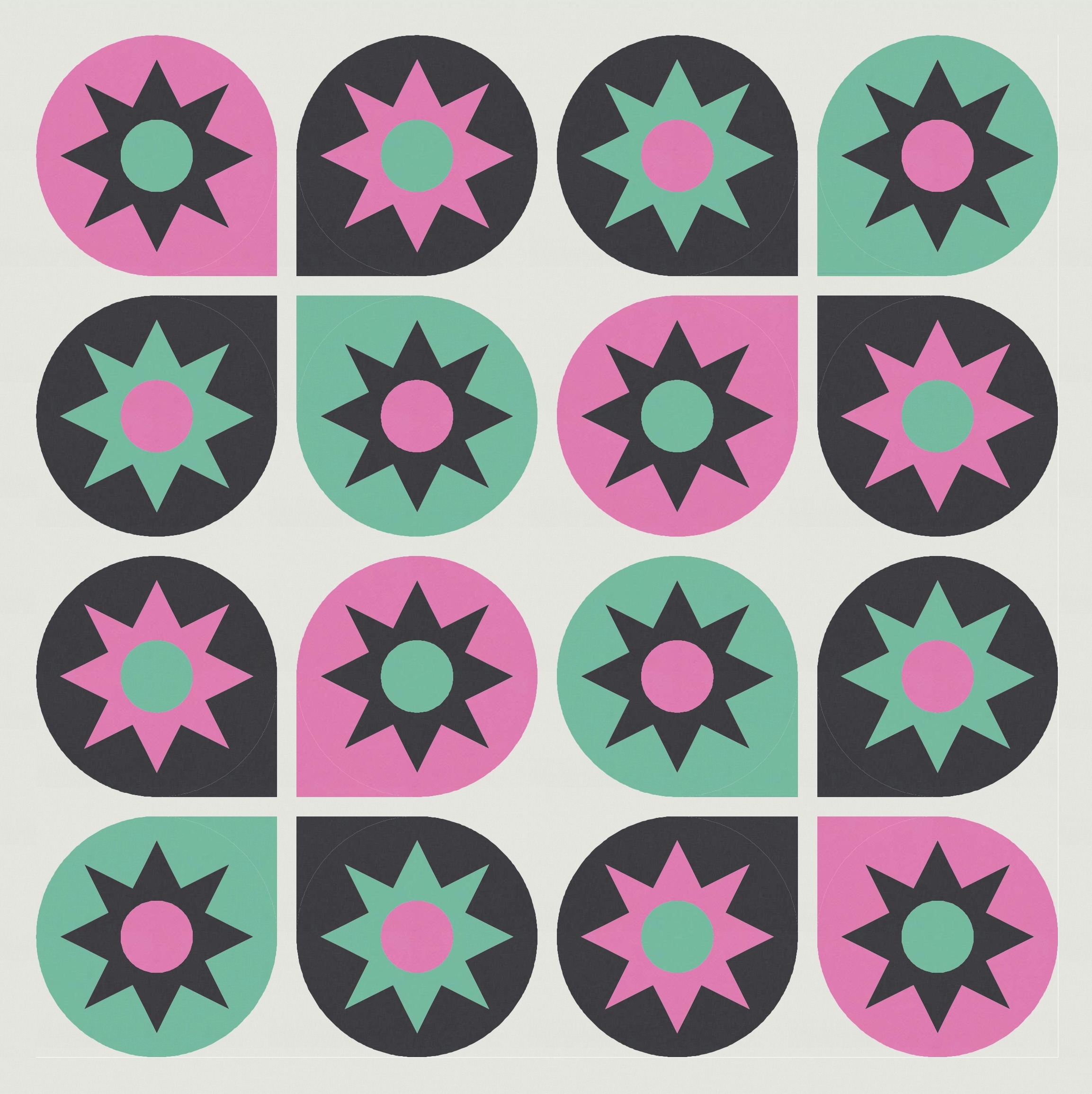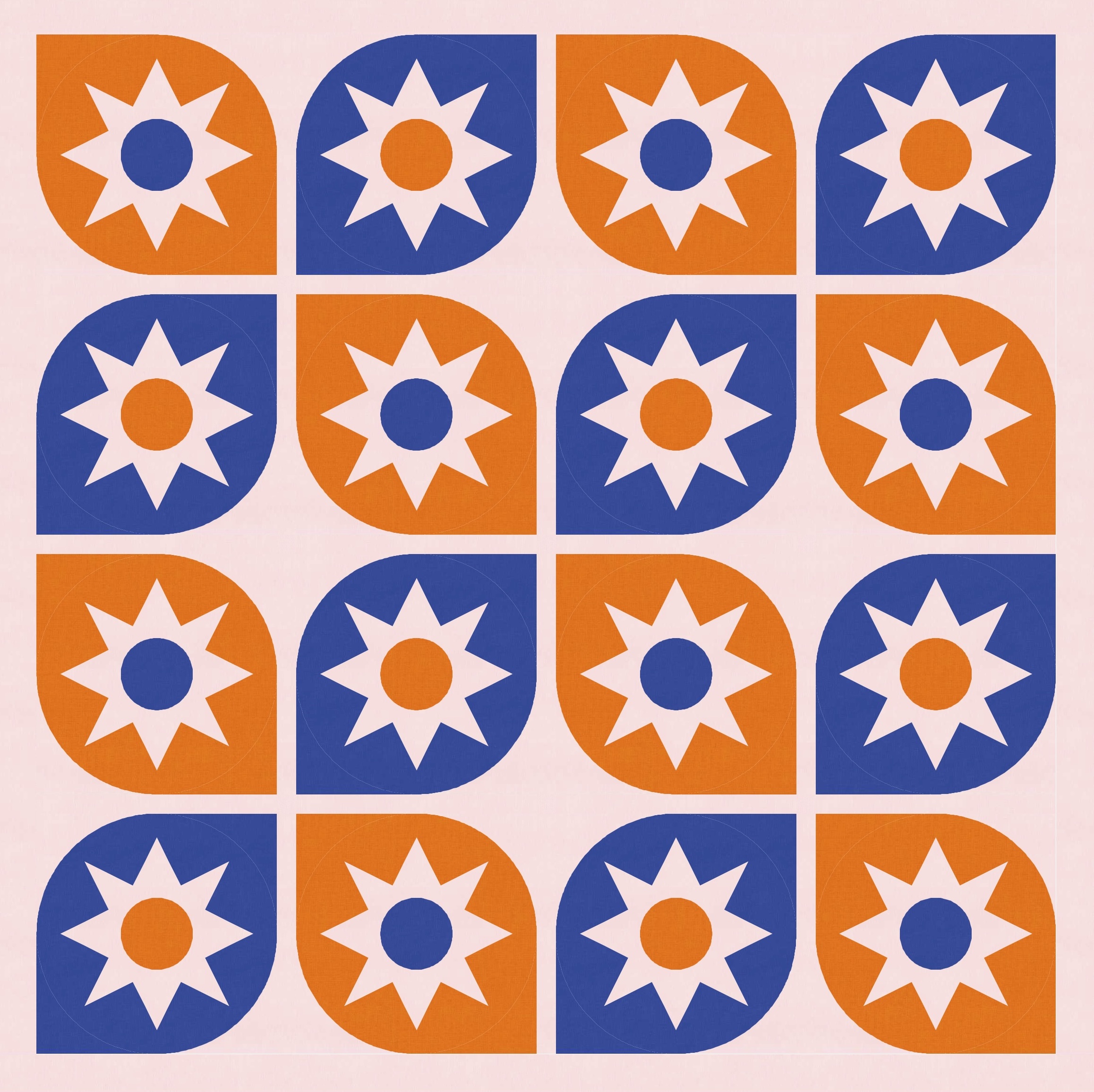 So far, I’ve coloured the star differently in each block and used the centre circle as the shared colour (same as the background colour) across all blocks. But I also like the effect of making the star the shared colour, with the centre circles coloured in the background instead. The stars really pop out in this version (and they give me slight Clockwork Orange vibes.)