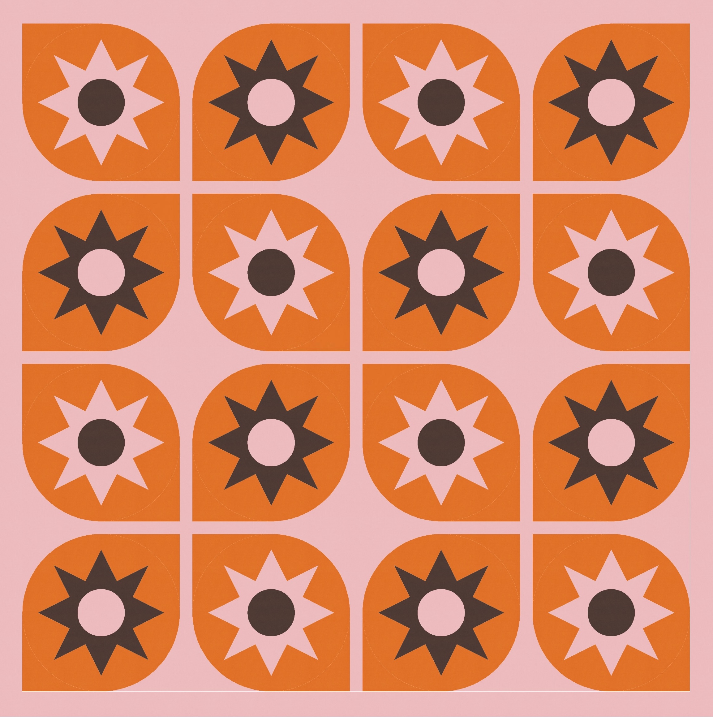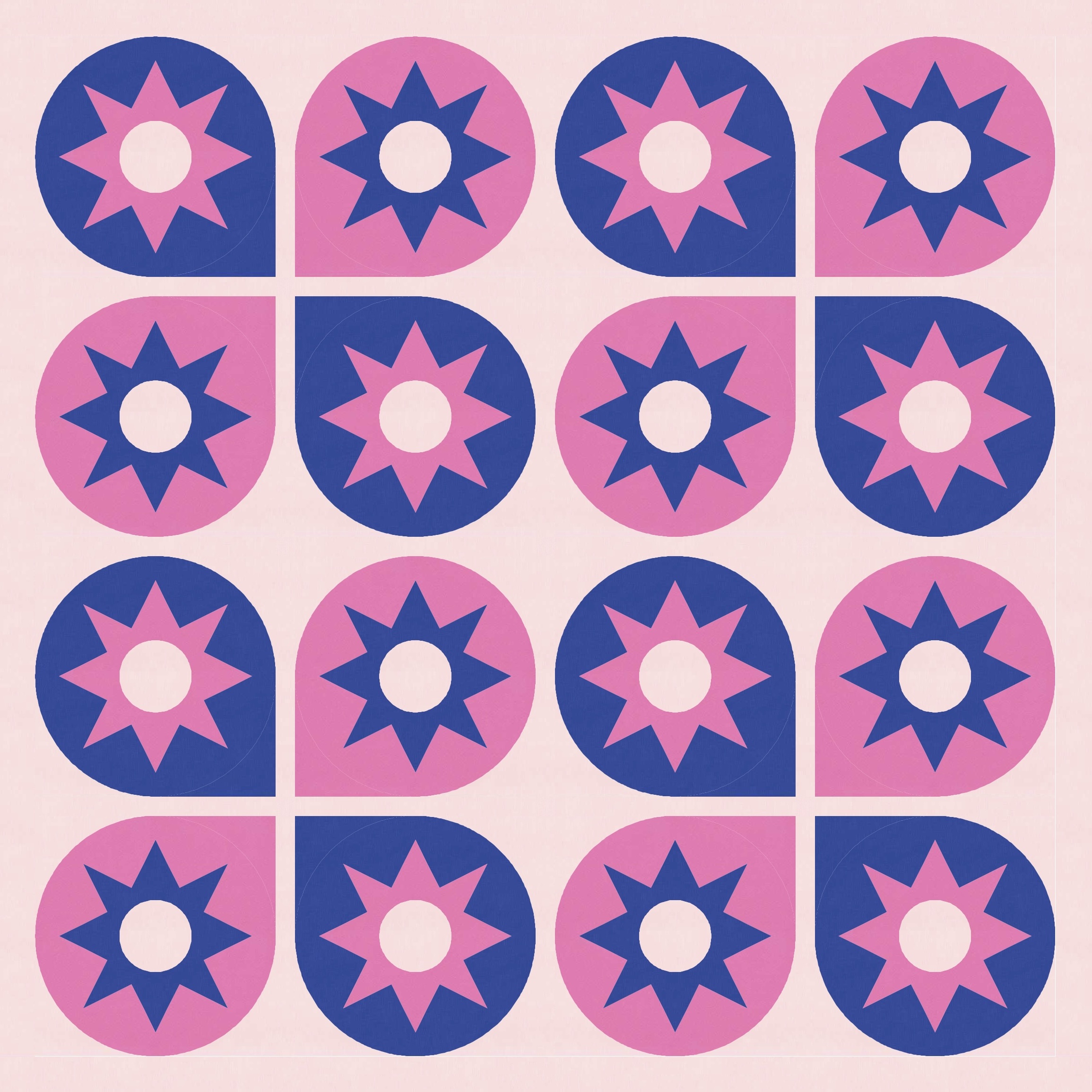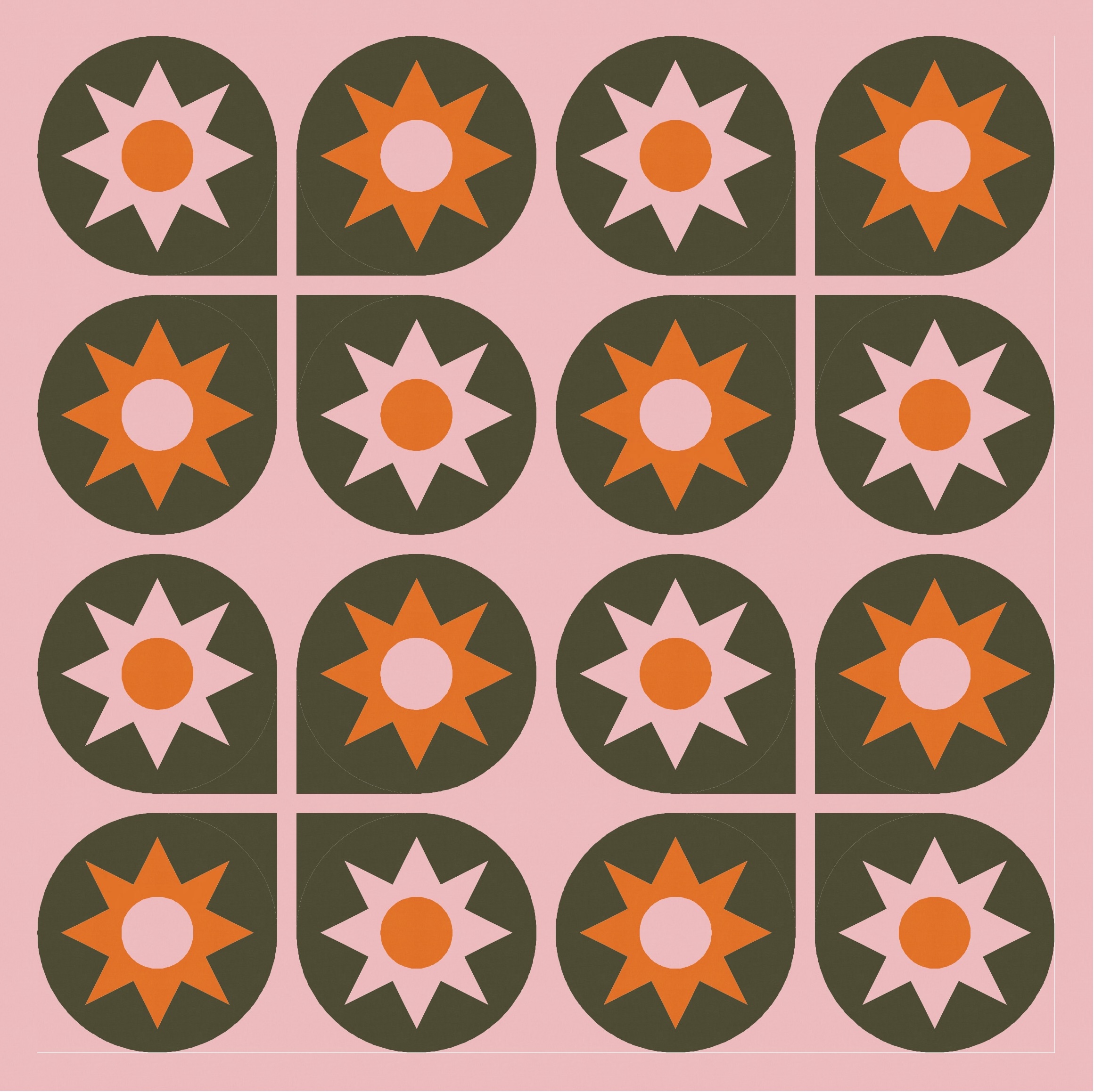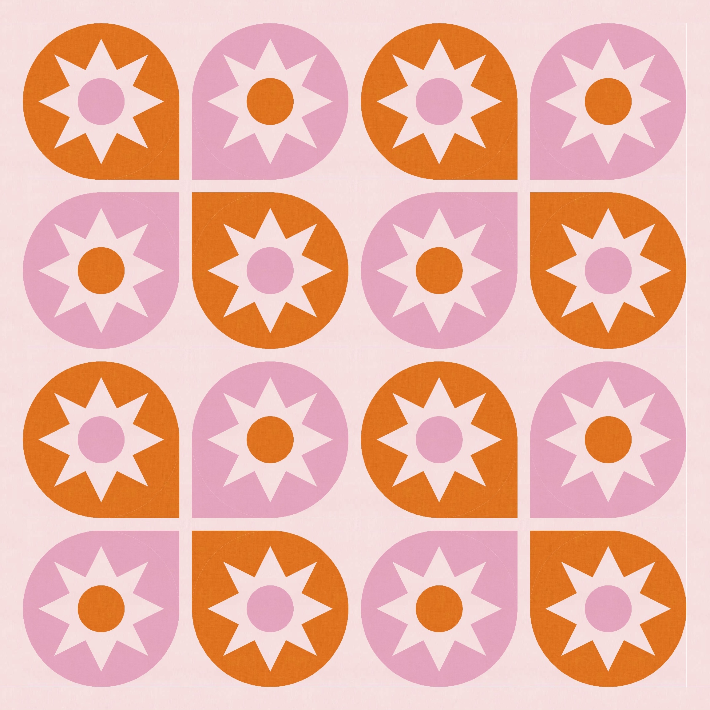 So far, I’ve coloured the star differently in each block and used the centre circle as the shared colour (same as the background colour) across all blocks. But I also like the effect of making the star the shared colour, with the centre circles coloured in the background instead. The stars really pop out in this version (and they give me slight Clockwork Orange vibes.)