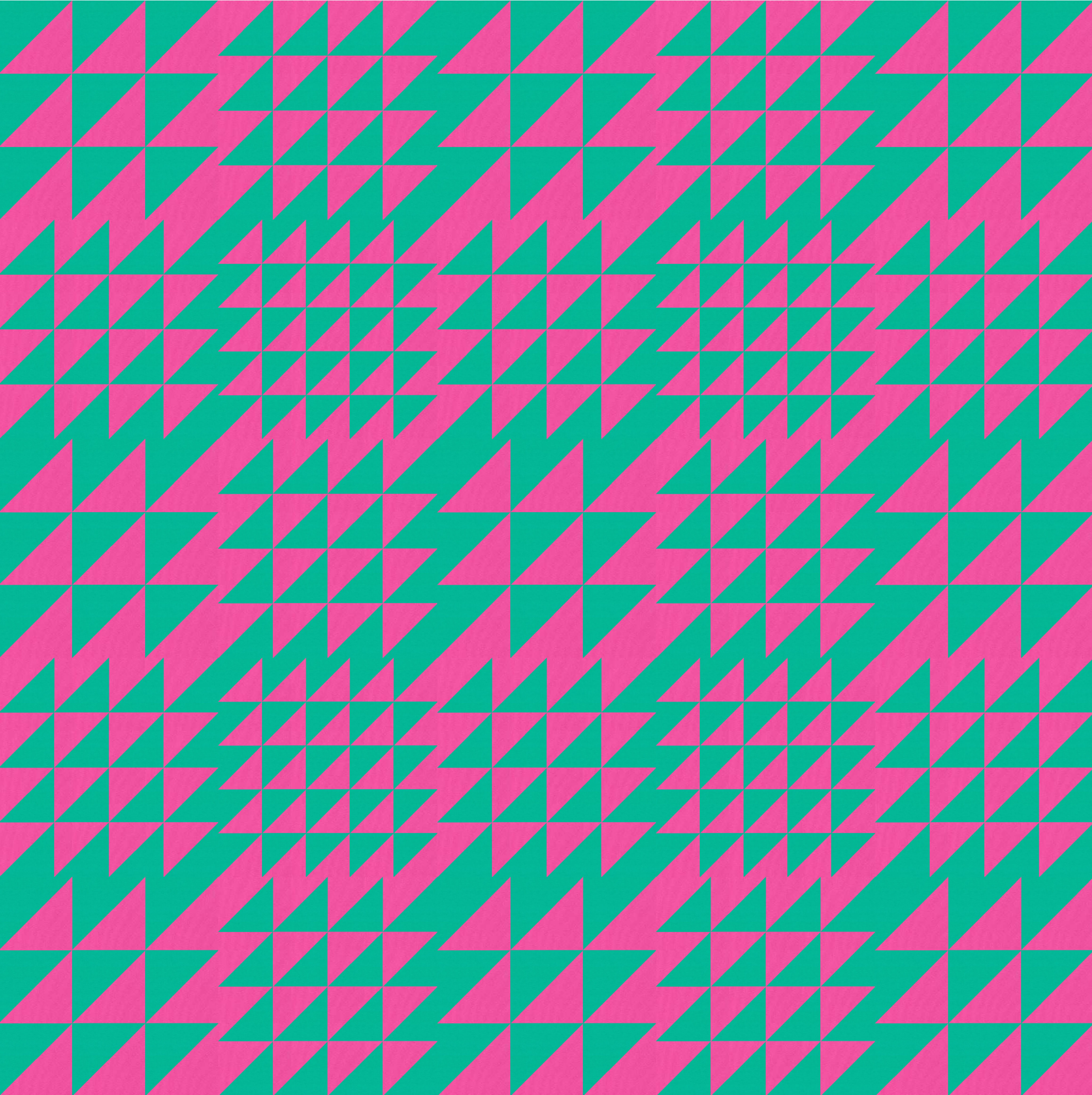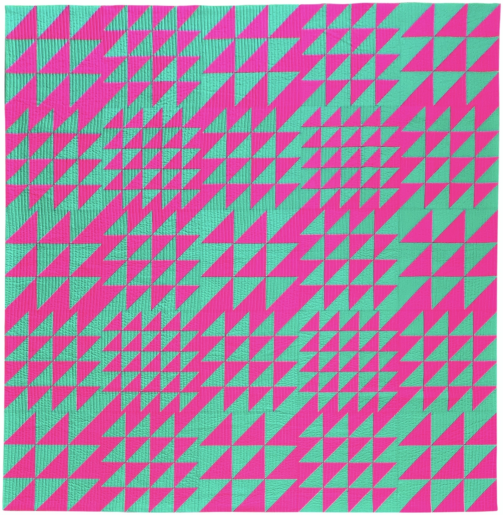 You can see a few differences between the sketch and the finished quilt: I changed the number and placement of each block type, and I opted for a different colour palette. I’d already made a blue and green quilt recently (Shadowbox, based on Sunday sketch #432), so I wanted something different. Because the design itself is quite jarring and chaotic, I wanted a pair of colours that kinda clashed and enhanced that feeling of not being able to look at the quilt for long. I was really aiming for that ‘in your face’ kinda feeling. Here’s what I landed on. See what I mean?