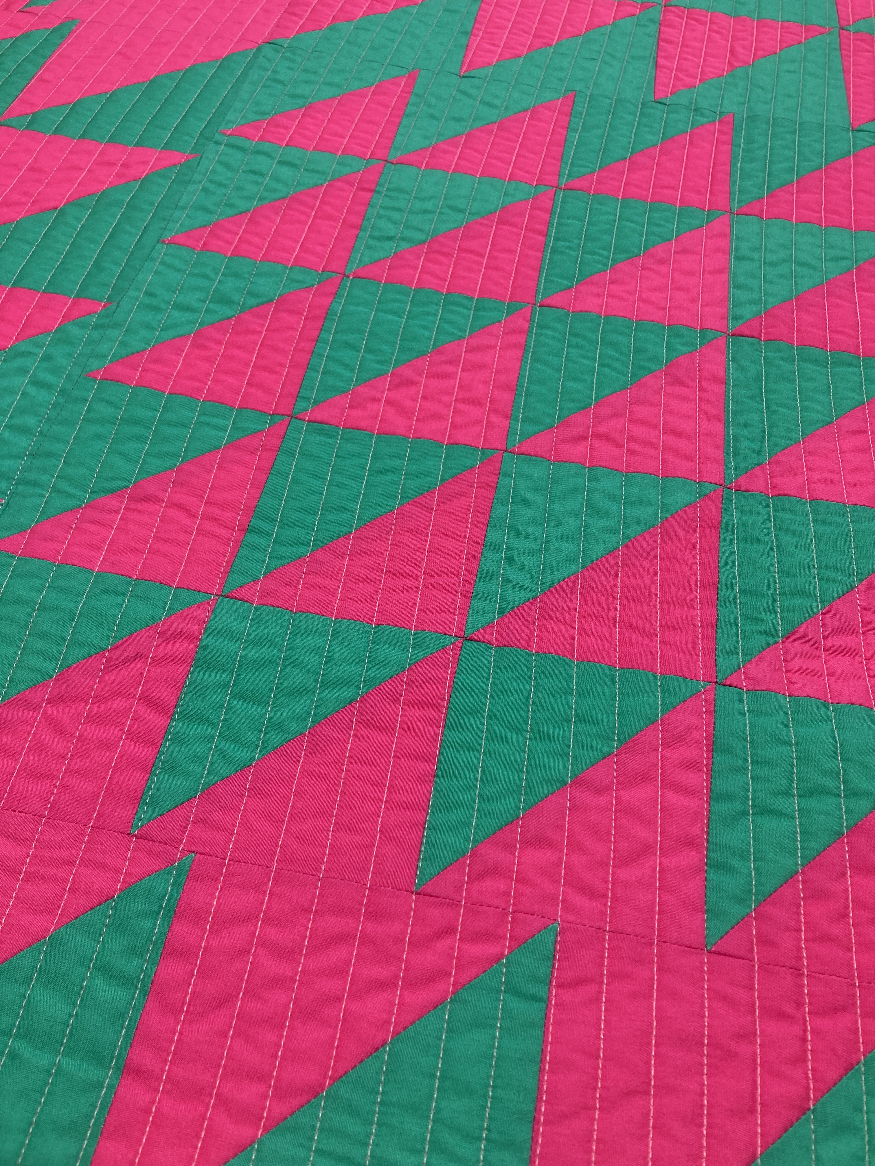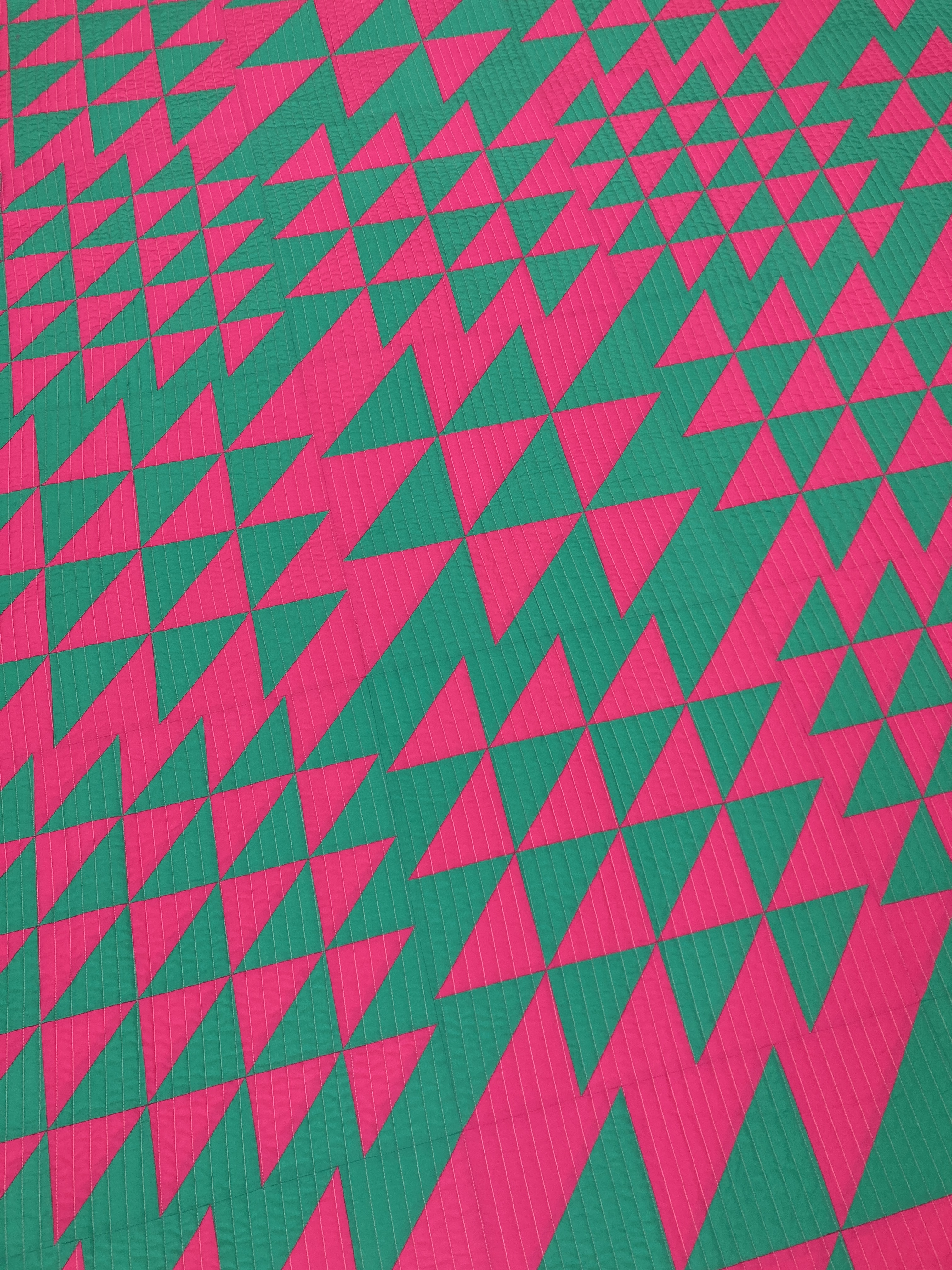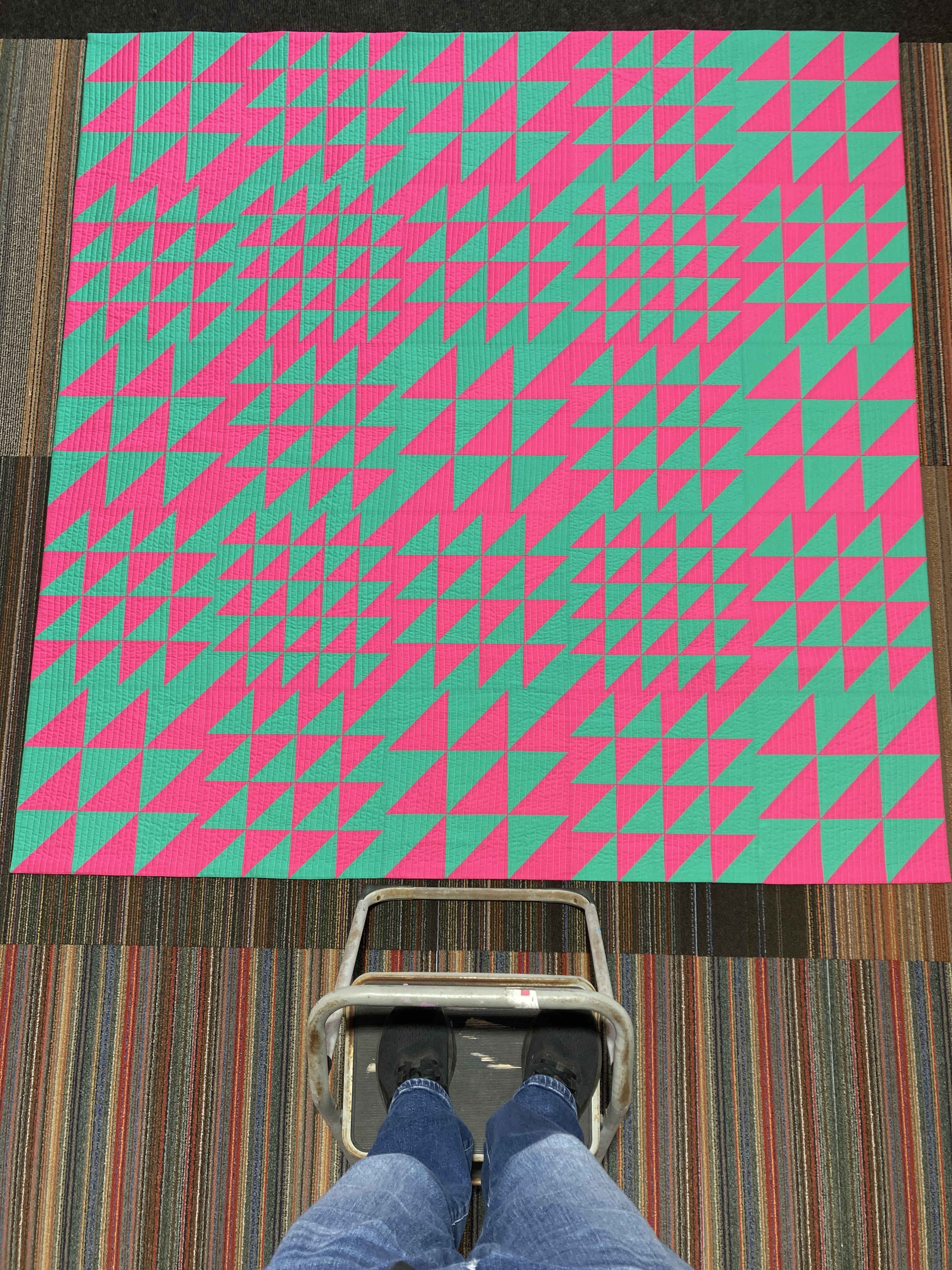 Pep was quilted by Valerie Cooper of Sweet Gum Quilting using ‘Good Vibrations‘, an edge-to-edge design by Patricia Ritter that features repetitive waves. Valerie spaced the lines 1/2″ apart and used a light pink thread. I don’t think it’s immediately obvious that the lines aren’t straight, so their waviness just adds to the overall disorienting feeling when you look at the quilt. I love it!