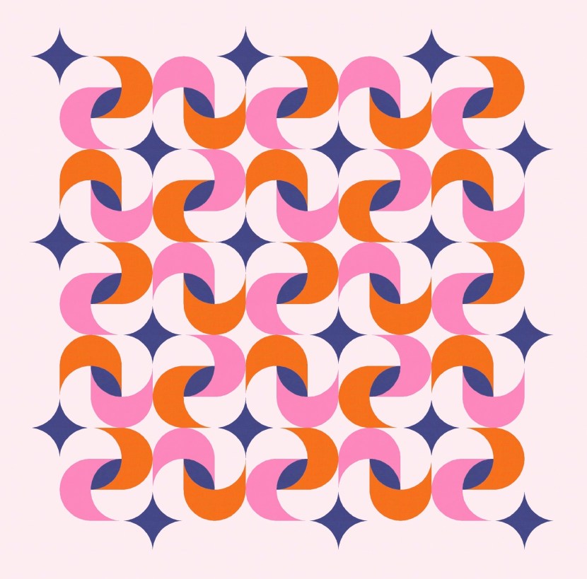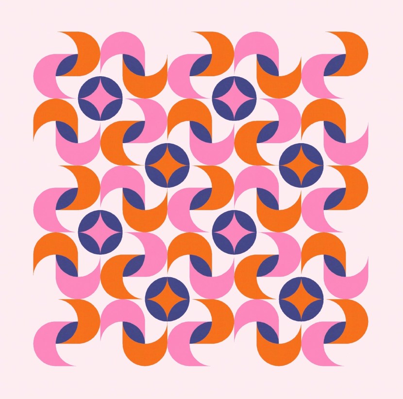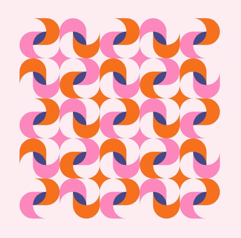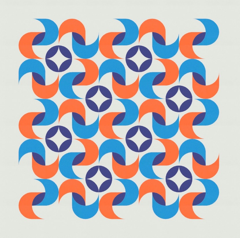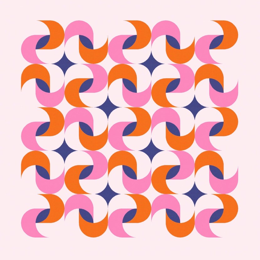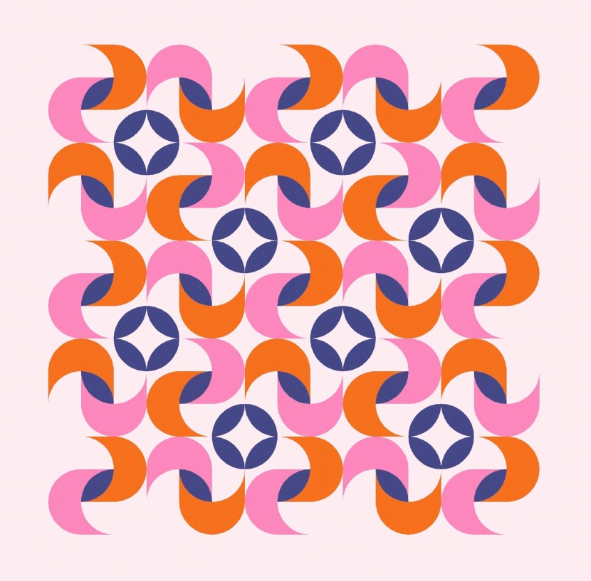 This is a block-based design; the layouts shown here are 5 × 5. Originally I just had the curvy twist in each block, but then I added two orange peels in diagonal corners, parallel with the one that’s in the middle (as the inner shadow of the twisty bit); those peels then create the circles between the blocks.
