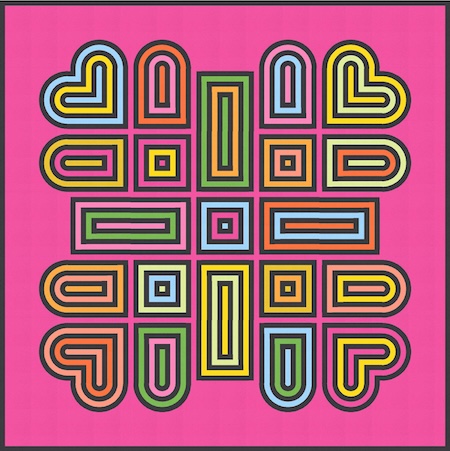 It’s a block-based design, and each block has three distinct elements: four small circles, four orange peel units, and an outer squircle encompassing everything. So a two-colour palette is possible (though not very interesting), but a palette of three or more colours is best.