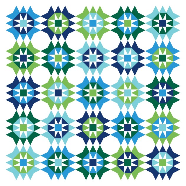 So this is the first design in the series where all the triangles are actually coloured in. You can see the similarities with the past two weeks’ sketches – that inner star, surrounded by an octagon, with an outer shell of half-square triangles (and now triangle-in-a-square units). And, of course, with so many elements in the basic block, there are loads of colouring options.
