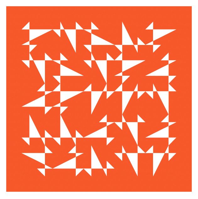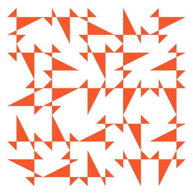 This is a single block that’s repeated, rotated and flipped. The block has two half-square triangles (of the same size) and two half-rectangle triangles (one big, one small). My only rule when arranging the blocks was that a tip of a triangle in one block had to touch the tip of a triangle in the adjacent blocks. Well, there was maybe one more rule: I tried to avoid adjacent blocks being in the same orientation, although I can see a few in there.