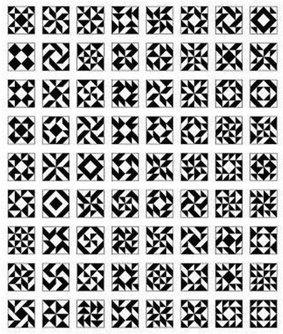 This awesome collection of 72 quilt blocks was actually generated automatically using a computer program written by Mark Jason Dominus. From what I can tell from his webpage, he was inspired by a girlfriend who was into quilting; when they got married, she made a quilt from these blocks as a present on their wedding day. Like there’s not enough to do in the run-up to a wedding….