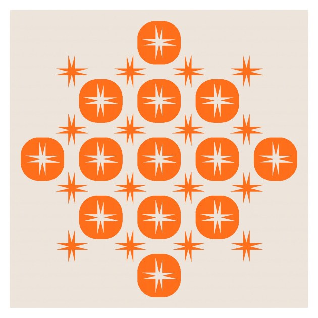 This is one of those apparently simple designs that I feel is a bit more complex on closer inspection. Each of the two blocks in each quadrant extend into the two adjacent quadrants. For example, at the top left, the orange squares continue on into the top-right quadrant, while the light stars against an orange background continue down to the bottom-left quadrant. At the top right, the orange stars against a light background continue down the design, while the orange squares continue across. It’s the same for each quadrant; they’re all connected.
